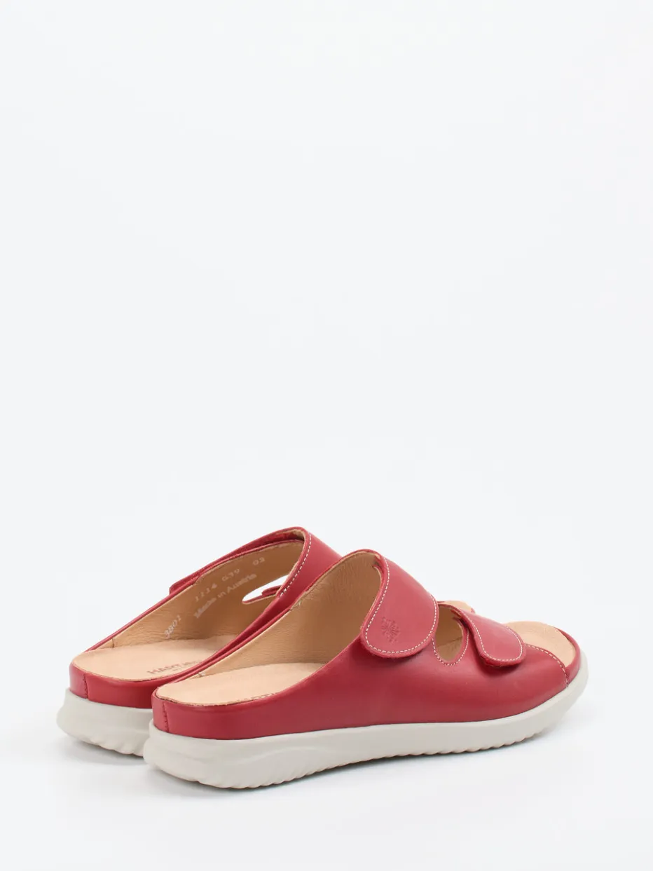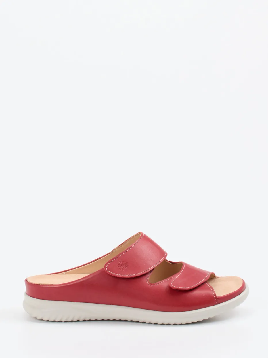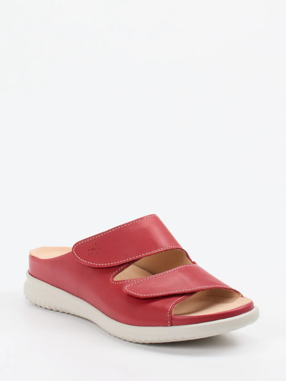 Für jeden Schritt bequem gewappnet.Die Marke Hartjes präsentiert eine komfortorientierte Damen-Pantolette in moderner Breeze-Form. Ein leichtes Laufgefühl für entspannte Sommertage bietet das handschuhweiche rote Kalbleder mit matter Oberfläche. Zwei individuell verstellbare Klettverschlüsse sorgen für optimalen Sitz. Das gepolsterte Leder-Kork-Fußbett unterstützt ergonomisch und lässt sich bei Bedarf gegen Einlagen austauschen. Dank griffiger Profilsohle eignet sich das Modell perfekt für Alltag und Zuhause. Dezente Ton-in-Ton-Nähte und ein geprägtes Logo runden das minimalistische Design stimmig ab. Komfort trifft auf Funktion – in gewohnt verlässlicher Hartjes-Qualität.