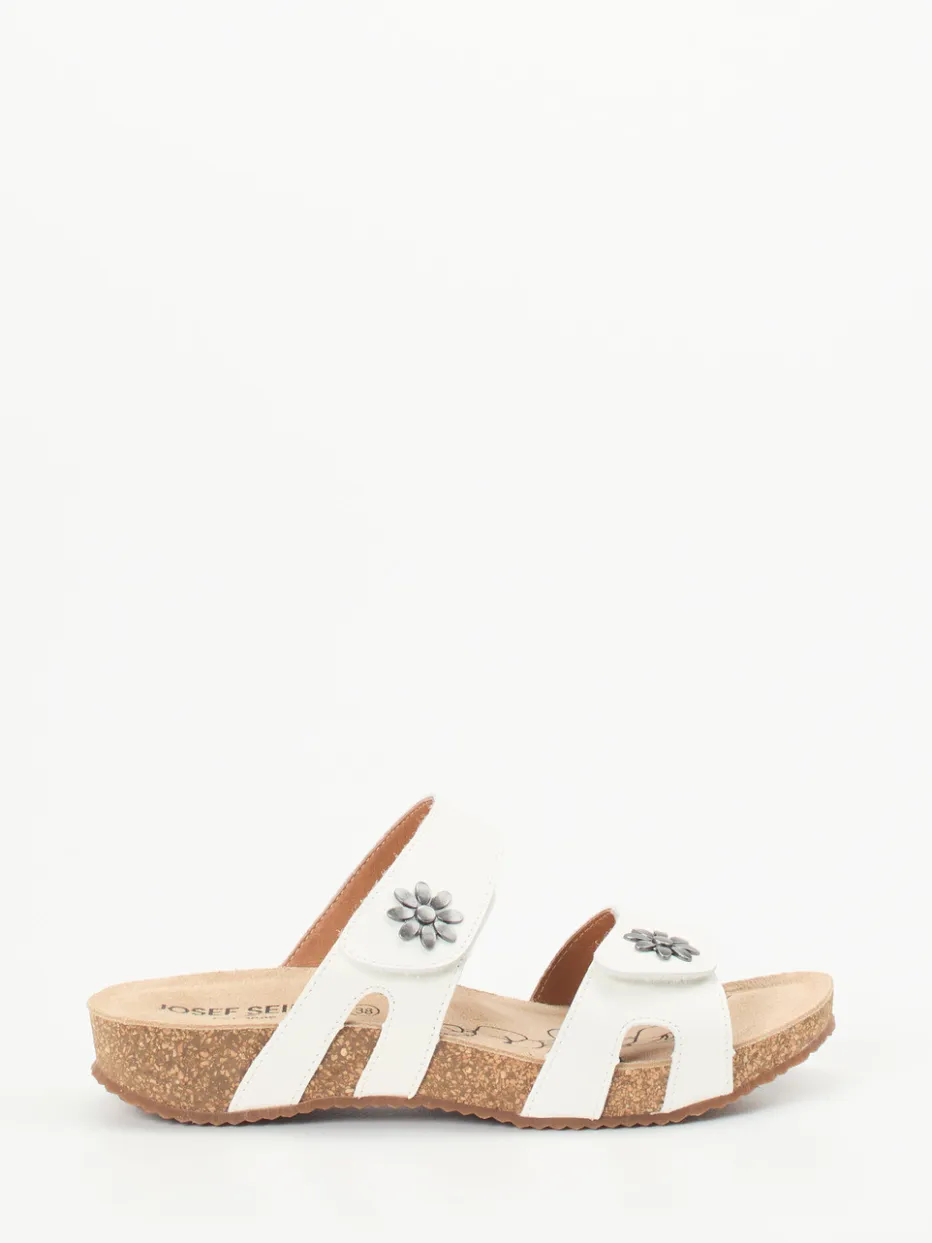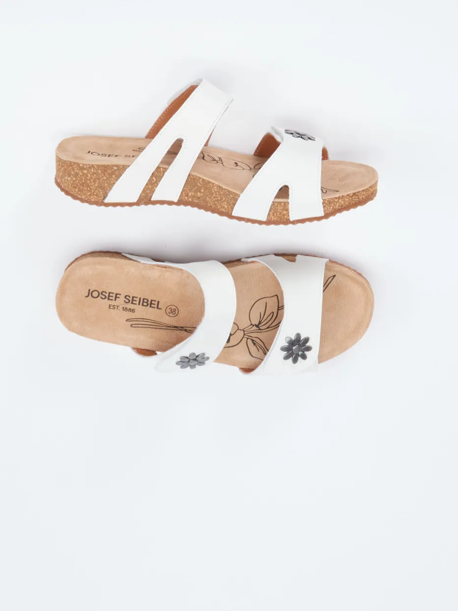 Sommerlicher Komfort mit liebevollem Detail.Josef Seibel präsentiert komfortable Damen-Sandalen in Pantolettenform. Für entspannte Urlaubstage oder den Wohlfühlmoment zu Hause bieten diese weißen Kalbleder-Pantoletten mit ihren zwei praktischen Klettverschlüssen eine optimale Passform. Das weiche Korkfußbett ist ergonomisch geformt und wird von einer profilierten Gummisohle ergänzt. Silberfarbene Metallblüten und das floral bedruckte Fußbett verleihen dem schlichten Design subtilen Charme. Die offene, ergonomisch angepasste Silhouette folgt klar dem Komfortprinzip und greift aktuelle Naturmaterial-Trends auf. Ideal kombinierbar mit Leinenhosen und luftigem Casualwear. Josef Seibel verbindet Funktionalität mit sommerlicher Leichtigkeit.