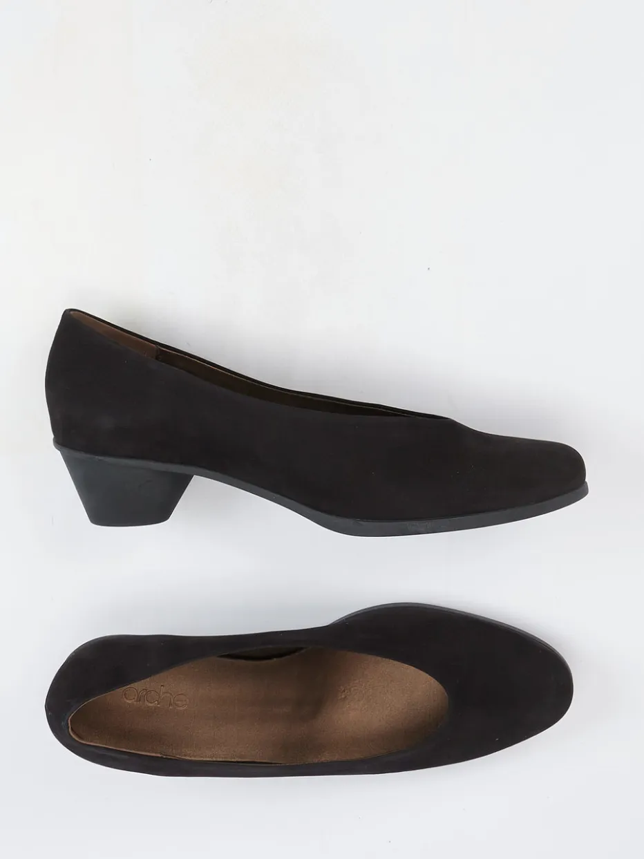 Einen sportlichen Pumps präsentiert die Marke Arche hier. Auf dem verrundeten Leisten ist das schlichte, schwarze Nubukleder wunderbar weich verarbeitet. Kombiniert wird der zeitlose Stil mit einem Höchstmaß an Komfort. Die dezent profilierte Latexsohle mit dem sich leicht verjüngenden, blockigen Absatz ist hochwertig und funktional.