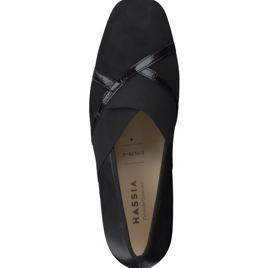 Eleganz trifft bequeme Linienführung.Die Marke Hassia präsentiert einen Komfort-Pumps für anspruchsvolle Damen mit stilvollem Alltag. Für Büro und Freizeit gleichermaßen geeignet, überzeugt das fein abgestimmte Modell durch eine Kombination aus schwarzem Samtziegen-Veloursleder, glattem Kalbleder und dekorativen Lackleder-Details. Die klassische, leicht spitz zulaufende Form mit quadratischer Front wird durch zwei breite Elastikbänder modisch ergänzt und sorgt gemeinsam mit der Komfortweite J für optimalen Halt. Eine halbe Leder-Gummisohle, das herausnehmbare Fußbett und der dezente Blockabsatz runden den funktionalen Komfortanspruch ab. Der Look ist der „Quiet Luxury“-Stilrichtung zugeordnet und wirkt besonders edel in Kombination mit monochromen Office-Outfits. Ein bequemer City-Pumps, der Ästhetik mit Komfortexzellenz vereint.