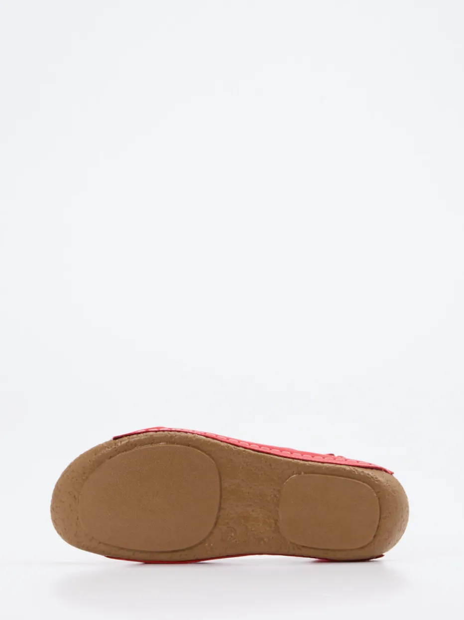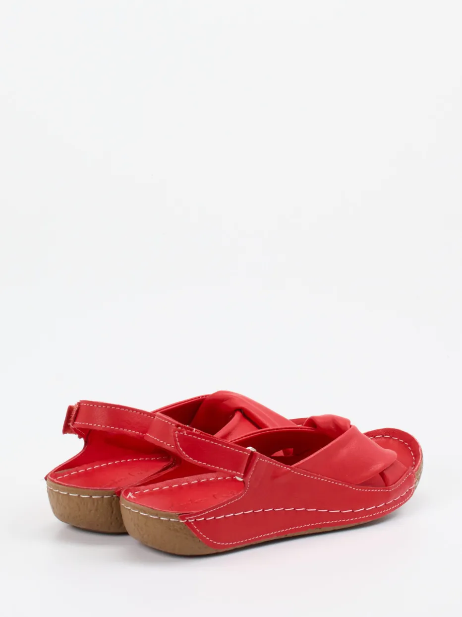 Die Kombination aus rotem Kalbleder, flexibler Gummisohle und ergonomischem Schnitt ergibt eine stilvolle Komfortlösung für entspannte Sommertage.