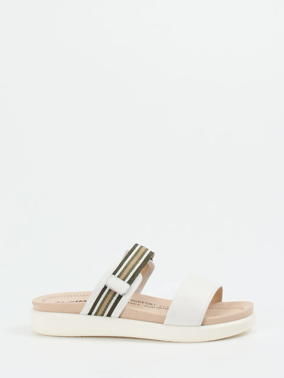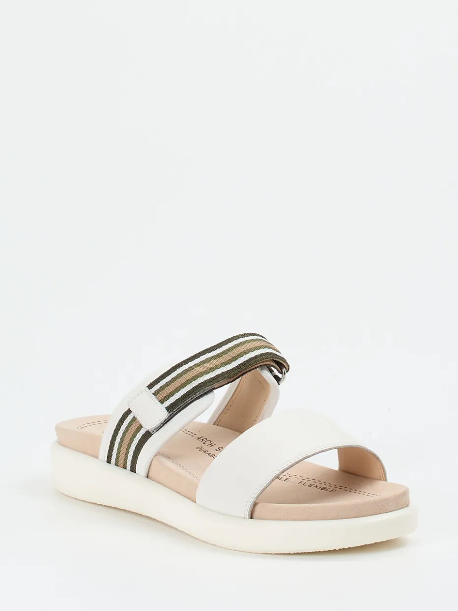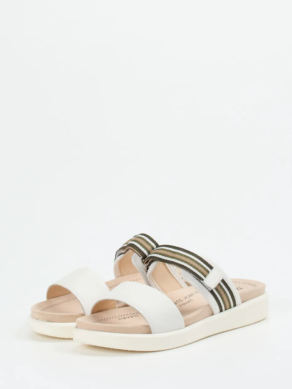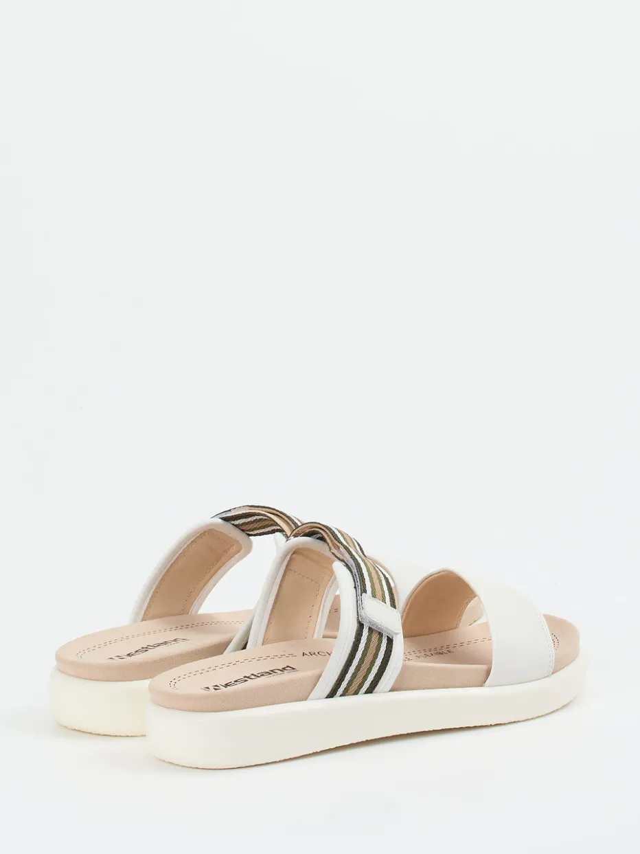 Leichtigkeit trifft auf Komfort.Westland präsentiert eine komfortorientierte Damen-Pantolette für den Sommer. Ein anschmiegsames Fußbett unterstützt ganztägig – sei es beim Strandspaziergang oder im Stadtbummel. Weißes Kalbleder mit mattierter Oberfläche wird durch ein mehrfarbig gestreiftes Textilband in Naturtönen und grünem Klettverschluss ergänzt. Die offene, flache Silhouette unterstreicht die klare Linienführung. Der praktische Klettverschluss sorgt für passgenauen Halt, während die rutschfeste Gummisohle sicheren Tritt bietet. Inspiriert von Minimalismus und „Quiet Luxury“ zieht sie Komfortliebhaberinnen mit casual Stil an. Ein verlässlicher Sommerbegleiter mit dezentem Trendcharakter – typisch Westland.