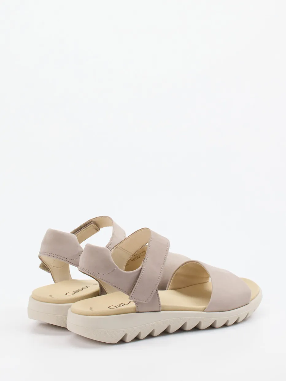 Bequem durch den Sommer.Gabor zeigt mit dieser Komfort-Sandale für Damen ein Modell für Alltag und Freizeit mit subtiler Eleganz. Das hell taupefarbene Nubukleder ist samtig angeschliffen und gibt der offenen, ergonomisch geformten Silhouette eine matte, softe Anmutung. Der Klettverschluss am Knöchelriemen sorgt für verlässlichen Halt und leichtes Handling. Eine flexible Gummisohle mit gezacktem Profil liefert Rutschfestigkeit – perfekt für längere Strecken. Die neutrale Farbgebung und der tonige Look harmonieren mühelos mit sommerlich-legerer Kleidung wie Leinenhosen oder Blusen. Weich gepolstert unterstützt das Fußbett alltagsgerechten Komfort im typischen Gabor-Stil.
