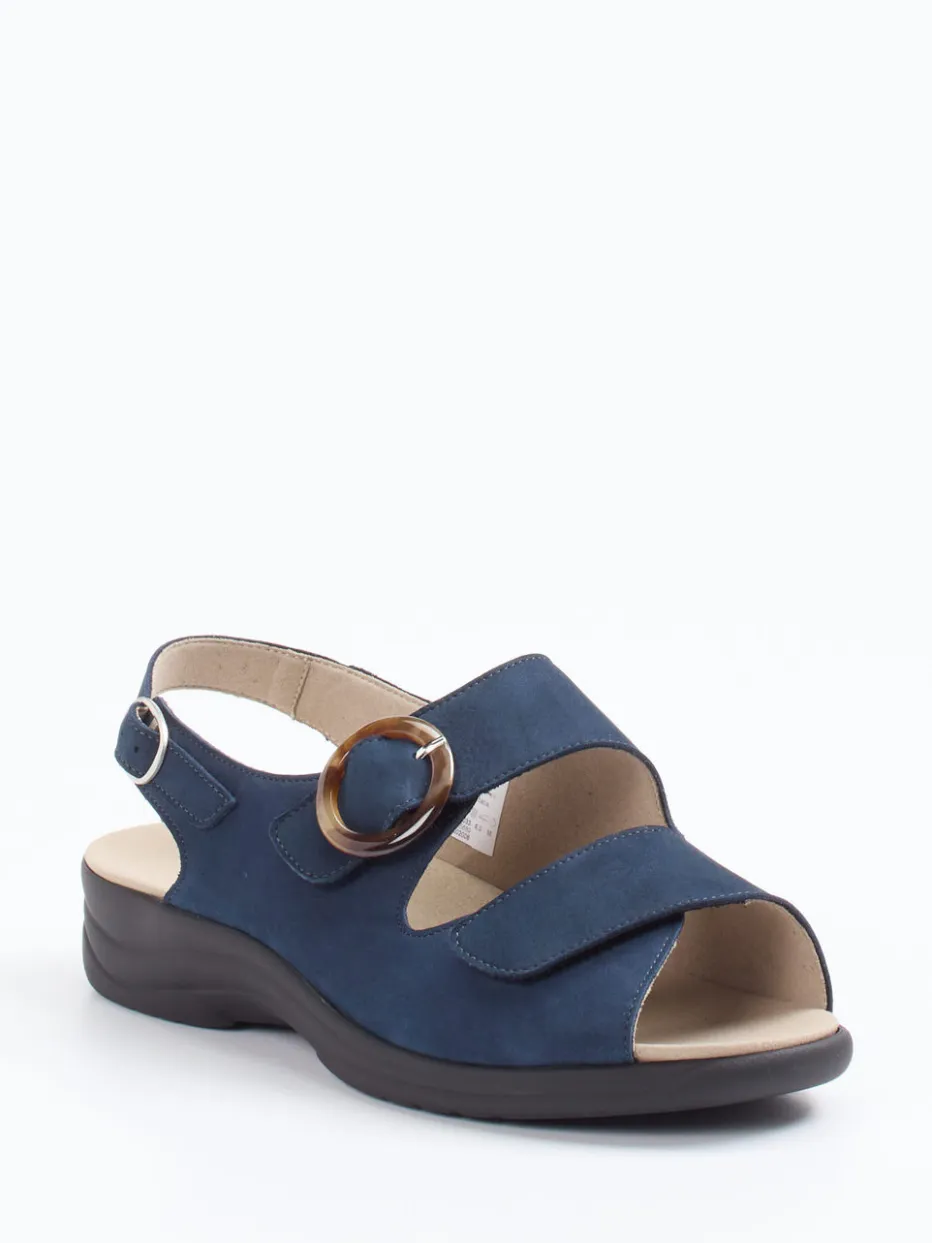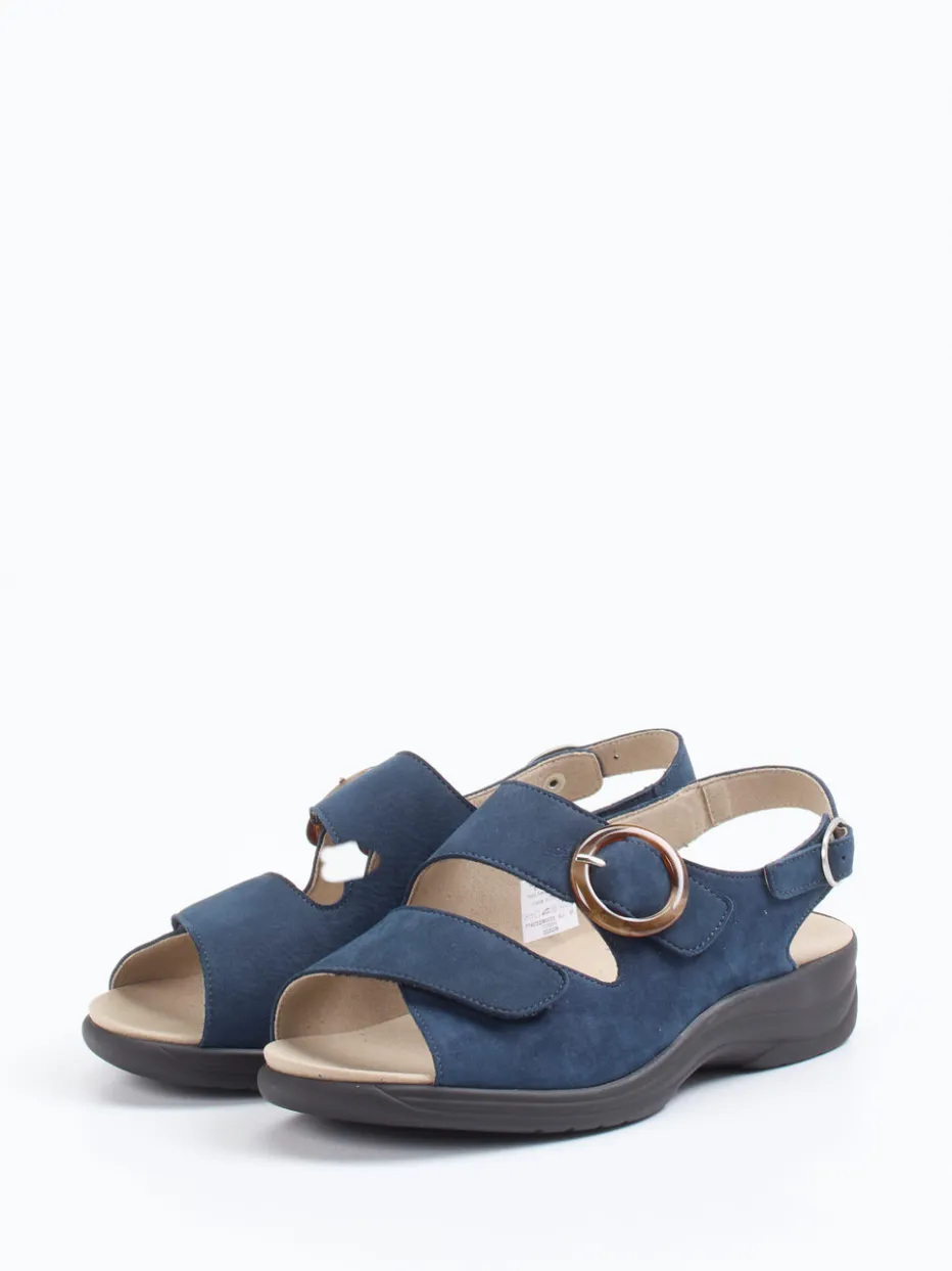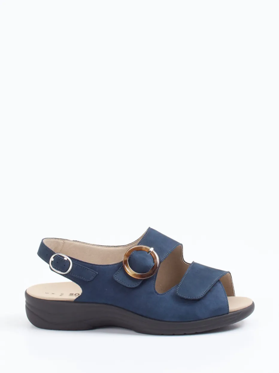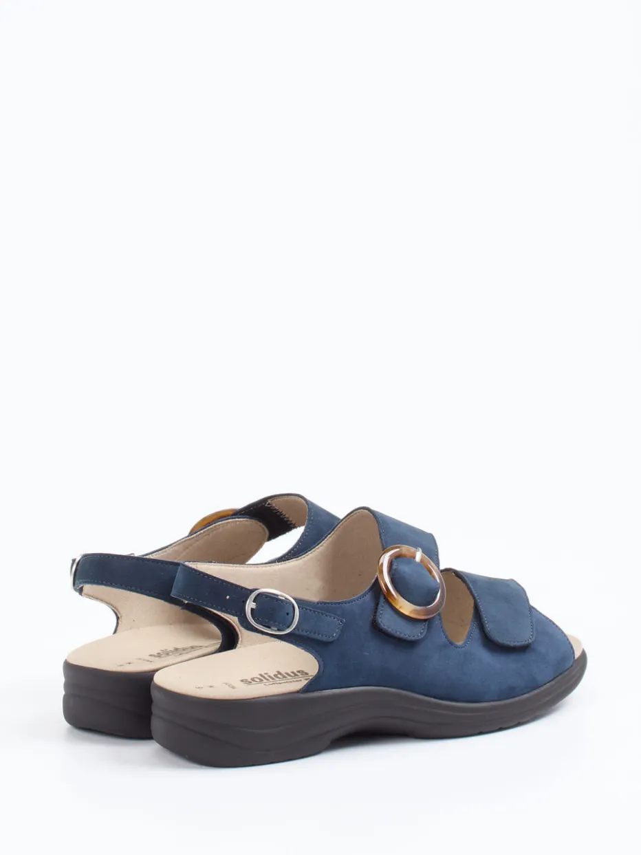 Schritt für Schritt gut unterstützt.Solidus präsentiert eine Damen-Komfortsandale für Alltag und Freizeit. Für lange Wege oder einfach nur entspanntes Stehen bietet das Modell optimalen Halt dank stufenlos verstellbarer Klettverschlüsse und ergonomischem Wechselfußbett. Das dunkelblaue Nubukleder mit samtiger Velourstextur wirkt edel und zurückhaltend. Auffällige Akzente setzen eine Schnalle in Hornoptik am Spann und eine silberfarbene Metallelemente. Durch das rutschhemmende PU-Profil laufen Füße auch auf glatten Böden sicher. Der flache Aufbau in Weite M verbindet Komfort mit klarer Linienführung – passend zum Trendthema „Quiet Comfort“. Solidus steht für durchdachtes Design und verlässliche Alltagstauglichkeit.