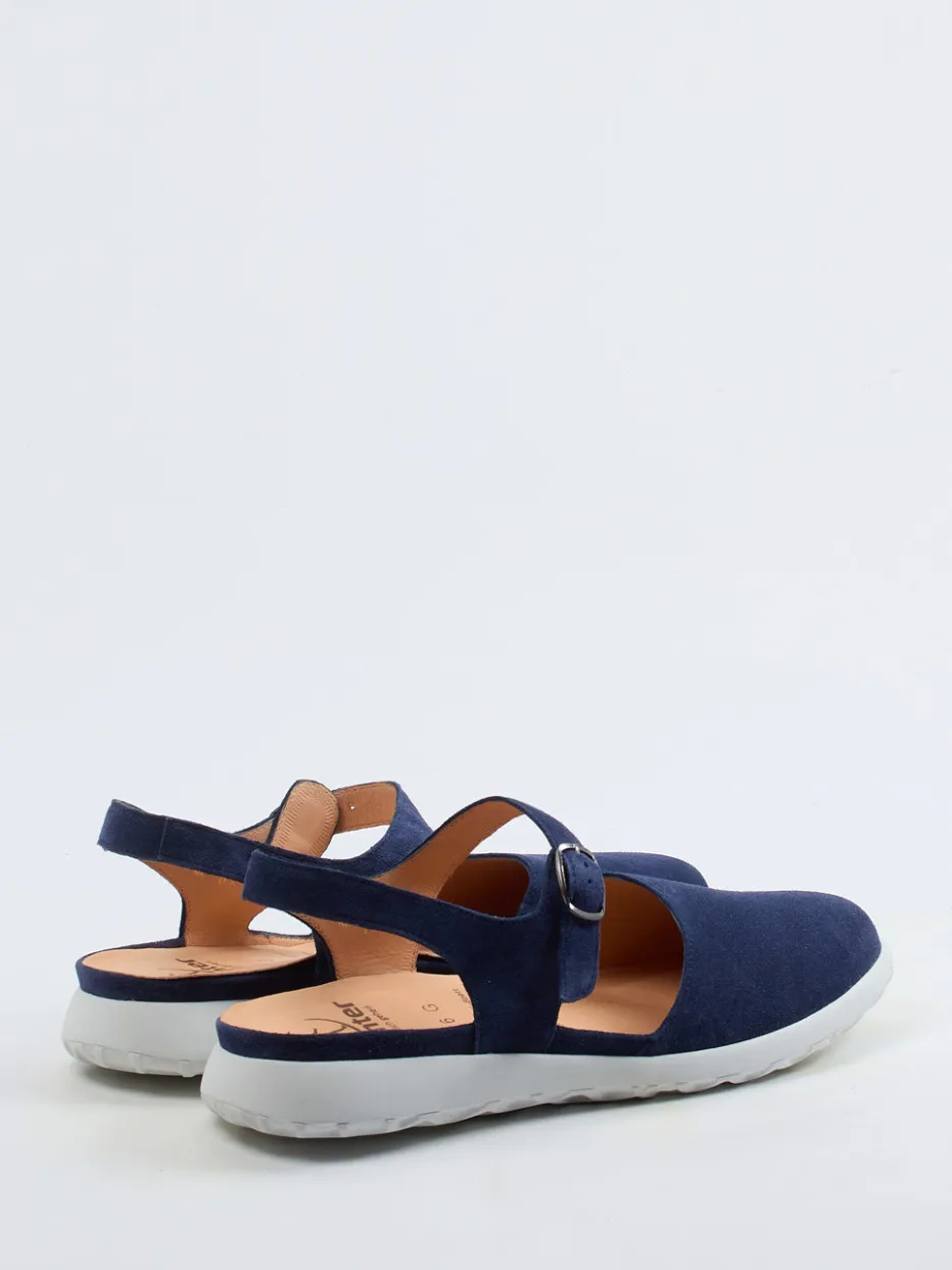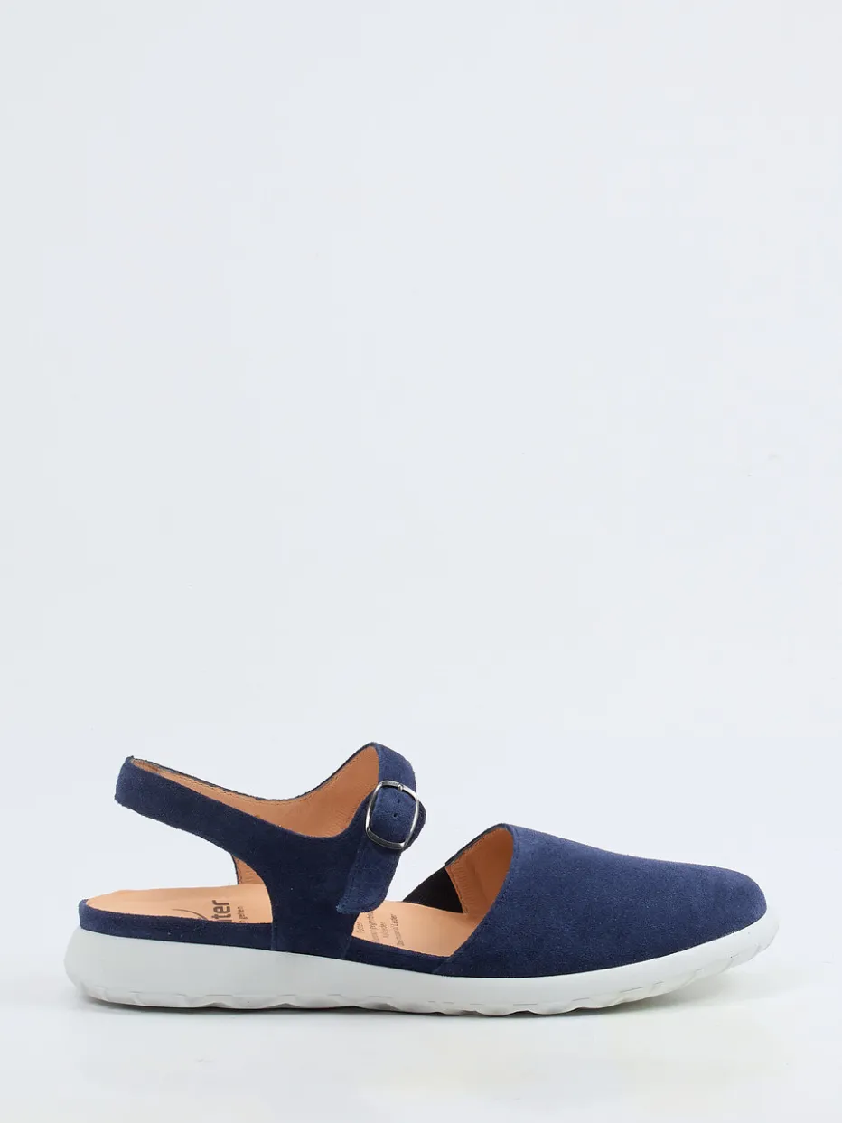 Komfort trifft auf sommerliche Eleganz.Die Marke Ganter präsentiert mit dieser Komfort-Sandale eine feminine Lösung für Alltag und Freizeit. Ob beim Stadtbummel oder auf Terrasse – das marineblaue Veloursleder mit matter Oberfläche verleiht der geschlossenen Front ein elegantes Finish. Die silberfarbene Metallschnalle am verstellbaren Fersenriemen sowie der elastische Einsatz sorgen für optimalen Sitz. Dank ergonomischer Gummisohle, lederbezogenem Fußbett und nachhaltigem Lederfutter eignet sich das Modell perfekt für ganztägiges Tragen. Das minimalistische Design mit Quiet-Luxury-Anmutung unterstreicht die klare Formsprache. Ganter steht hier für durchdachten Komfort und materialbewusste Qualität.