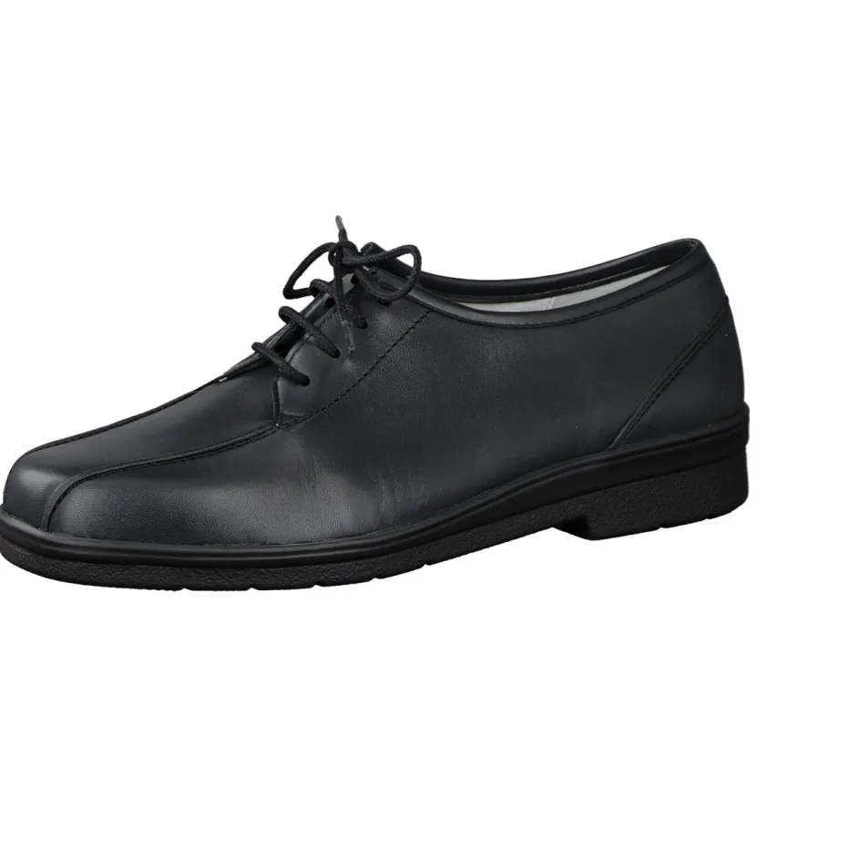 Weiches Kalbleder mit matter Oberfläche und Ton-in-Ton-Nähten sorgt für einen gepflegten Auftritt. Die dunkelblaue Farbe verleiht dem Schuh dezente Eleganz, während die ergonomische 5-Loch-Schnürung und die stoßdämpfende Gummisohle mit Luftpolster maximalen Tragekomfort sichern. Die klassische, niedrig geschnittene Silhouette unterstützt ein vielseitiges Styling – von Stoffhose bis Business-Kleid. Individualisierbar dank Einlageneignung und perfekter Passform in Weite G.