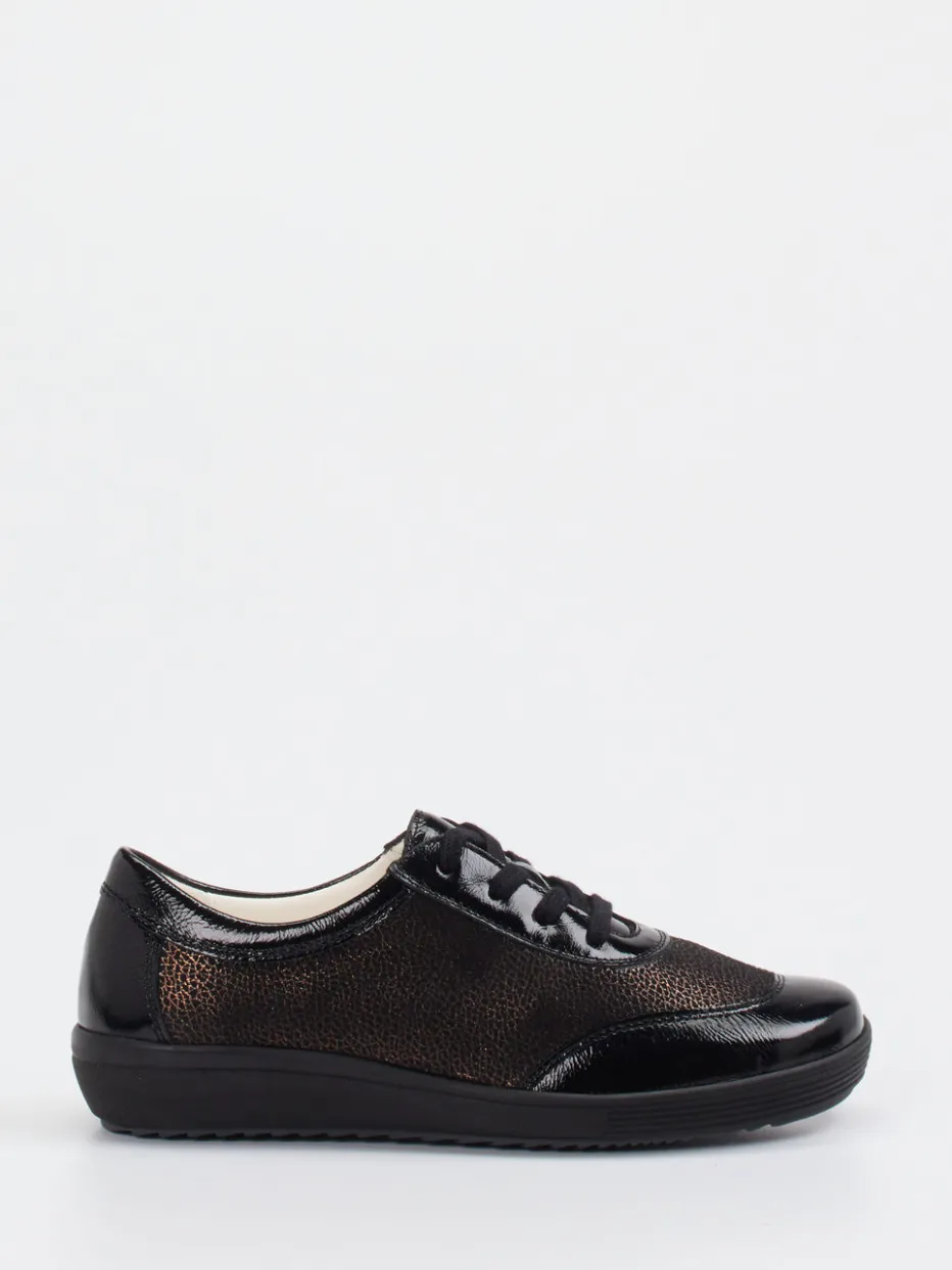 Komfort trifft edlen Metallic-Look.Christian Dietz präsentiert einen modernen Komfort-Schnürschuh für Damen. Ideal für aktive Tage, bei denen Tragekomfort und stilvolle Optik gefragt sind: Das schwarze Stretch-Lackleder zeigt eine glänzende Oberfläche mit changierendem Bronzeeffekt und strukturierter Textur. Die klassische, runde Form, gepolsterte Elemente und die rutschhemmende Gummisohle unterstreichen den Komfortaspekt. Eine Schnürung sorgt für passgenauen Sitz, während dezente Metallic-Akzente an aktuellen Herbst-/Wintertrends orientiert sind. Harmoniert stilvoll mit Stretchhosen oder strukturierten Taschen. Christian Dietz bietet mit diesem Sneaker maximale Bequemlichkeit in eleganter Anmutung.