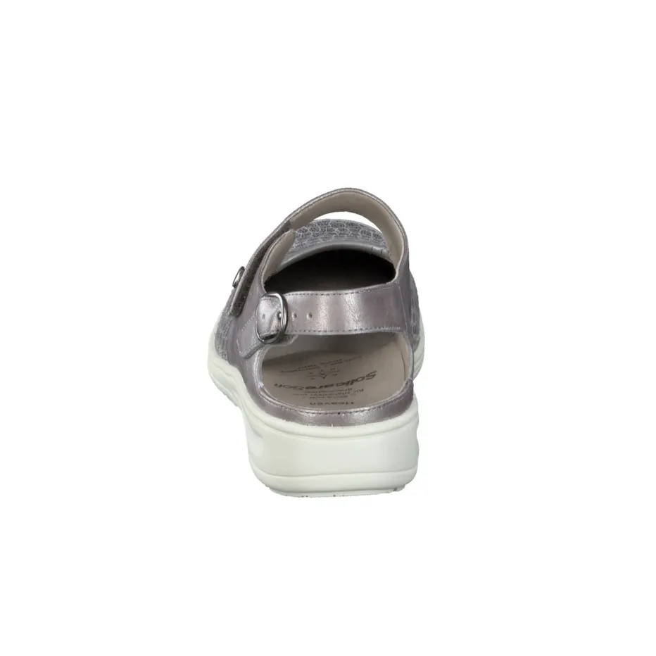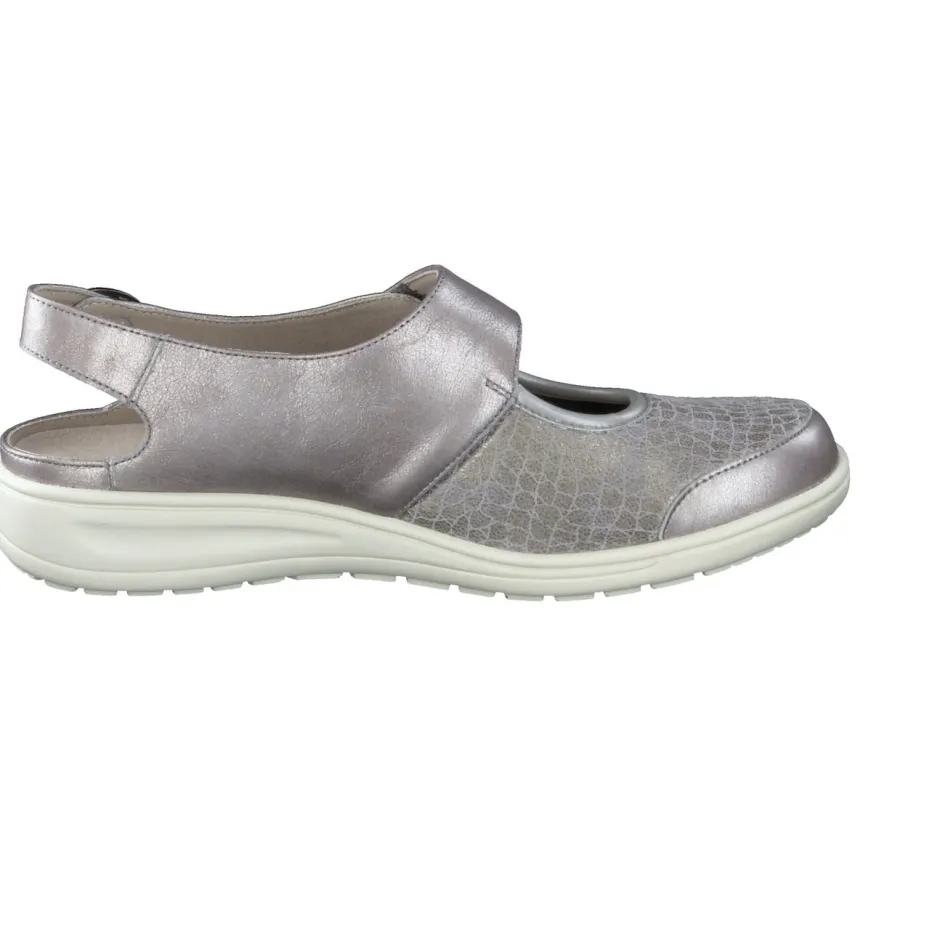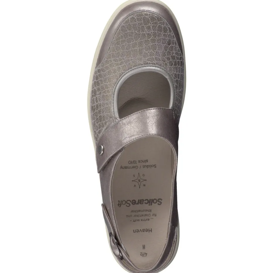 Die Marke Solidus präsentiert mit diesem Komfort-Slingback einen stilvollen und funktionalen Begleiter. Für den entspannten Innenstadtbummel oder lange Tage im Stehen bietet das Modell eine Kombination aus dehnbarem Stretchleder und ergonomisch geformter PU-Sohle. Die silbergraue Metallicoptik mit Krokoprägung verleiht moderne Eleganz, während die offene Ferse mit verstellbarem Klettverschluss individuell anpassbar ist. Ein gepolstertes, herausnehmbares Fußbett sorgt für zusätzlichen Komfort – auch bei orthopädischen Einlagen. Die profilierte Sohle unterstreicht das Komfortdesign mit sicherem Tritt. Ideal für Damen, die Alltagstauglichkeit mit modischem Anspruch verbinden.