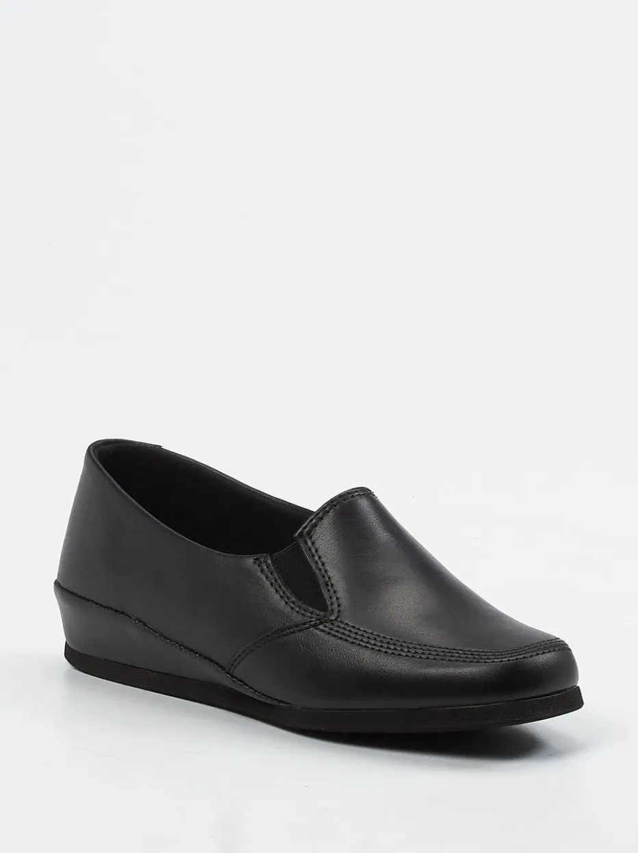 So bequem kann schlicht sein.Rohde präsentiert einen eleganten Komfort-Slipper für Damen. Ob beim Entspannen zu Hause oder für den Weg zum Briefkasten – der bequeme Hausschuh erfüllt alle Anforderungen an Funktion und Komfort. Gefertigt aus flexiblem, besonders weichem Kalbleder mit matt glatter Oberfläche, sorgt das Modell durch die seitlichen Elastikeinsätze für optimale Passform. Die schwarze Farbe und das minimalistische Design unterstreichen den zeitlosen Charakter. Eine rutschfeste Leichtzellsohle und warmes Textilfutter erhöhen den Tragekomfort an kühlen Tagen. Perfekt kombinierbar mit loungetauglichen Basics oder klassischen Freizeitlooks. Markentypischer Komfort trifft unaufgeregte Ästhetik – typisch Rohde.