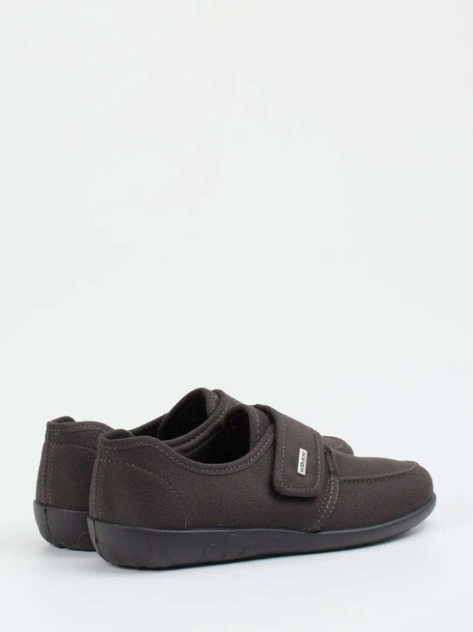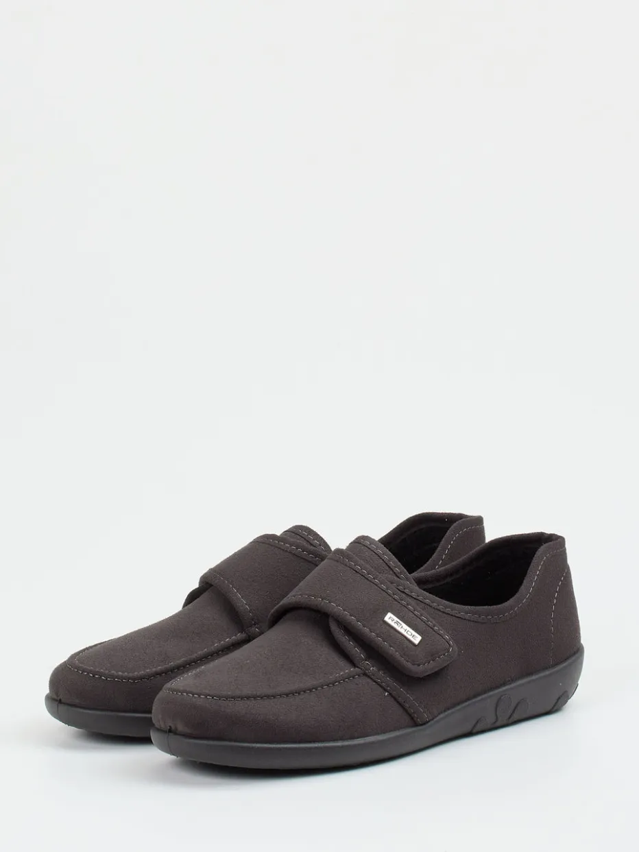 Gemütlichkeit bei jedem Schritt.Die Marke Rohde präsentiert hier einen komfortorientierten Damen-Hausschuh in Slipper-Form. Perfekt für entspannte Tage zu Hause bietet das Modell mit seinem samtartig matten Textilmaterial ein angenehm weiches Tragegefühl. Der dunkelbraune Look wirkt zeitlos dezent, während Details wie Ton-in-Ton-Nähte und eine kleine Metall-Logoapplikation das Erscheinungsbild veredeln. Der Klettverschluss erlaubt eine individuelle Anpassung, ein gepolsterter Einstieg maximiert den Komfort. Die rutschhemmende Gummisohle sorgt dabei für sicheren Halt. Optisch steht der Schuh für minimalistisches Design mit Fokus auf Funktion und Wohlgefühl. Ein Hausschuh, der Komfort und Understatement stilsicher vereint.