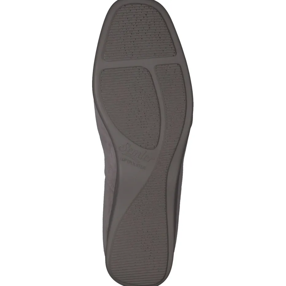 Komfort trifft auf zurückhaltende Eleganz.Der Komfort-Slipper von Semler bietet stilvolle Funktionalität für aktive Tage. Mit seinem hellgrauen Samtziegen-Veloursleder mit matter Oberfläche fügt sich das Modell harmonisch in minimalistische Looks ein. Tonale Nähte, eine verstärkte Fersen- und Zehenpartie sowie punktuelle Akzente aus Metallicleder betonen seine klassische Silhouette. Durch zwei Elastikeinsätze und die bequeme H-Weite passt sich der Schuh optimal dem Fuß an. Die herausnehmbare Innensohle und die flexible PU-Luftpolstersohle mit Keilabsatz sorgen für beständigen Gehkomfort. Inspiriert vom Stiltrend „Quiet Luxury“, bietet das Design dezente Wertigkeit. Ideal kombinierbar mit grauen Hosen oder neutralen Business-Outfits. Mit Semler ergibt sich Wohlgefühl aus Qualität und Passformkompetenz.
