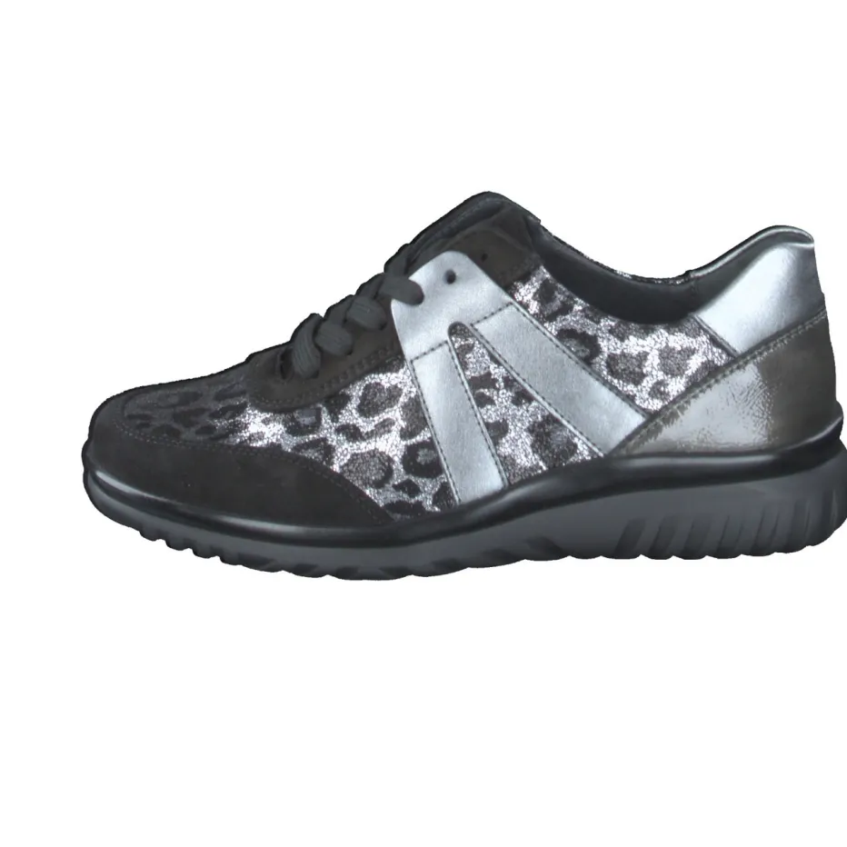 Ideal für urbane Alltagswege besticht das Modell durch geprägtes Leder mit changierendem Metallic-Finish in Grau und Silber. Veloursleder und glänzendes Textil mit Animalprint sorgen für eine ausdrucksstarke Textur. Die klassisch-runde Silhouette bietet mit gepolstertem Schaftrand und Weite H besonderen Komfort. Eine schwarze Schnürung erleichtert die individuelle Passformanpassung, während die profilierte Gummisohle mit Keilabsatz sicheren Tritt gewährleistet. Ein Wechselfußbett unterstreicht den funktionalen Anspruch. Perfekt kombinierbar mit dunklen Casual-Looks oder silberfarbenen Accessoires.