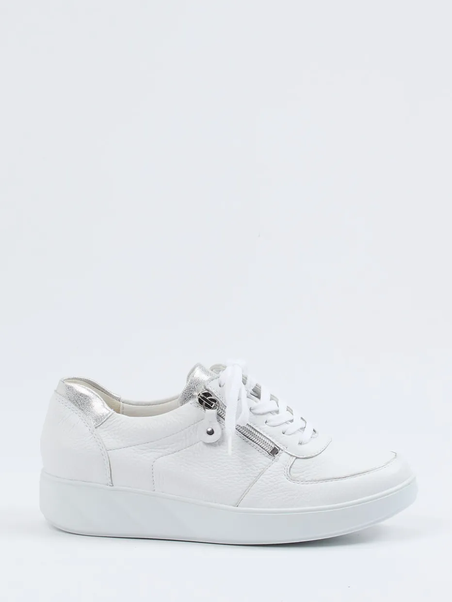 Stilvoller Minimalismus trifft auf Tragekomfort.Waldläufer zeigt mit diesem Komfort-Sneaker für Damen ein Modell, das Qualität und Alltagstauglichkeit gekonnt vereint. Für entspannte Tagestrips oder stilvolle Erledigungen in der Stadt bietet der Sneaker bequemes Laufgefühl in Weite K. Das weiße Hirschleder wirkt durch die genarbte Struktur besonders hochwertig und wird durch eine silberfarbene Metallic-Fersenkappe elegant ergänzt. Die klassische, runde Silhouette mit Schnürung und praktischem Reißverschluss ermöglicht einfaches Anziehen. Eine flexible PU-Sohle mit dezenter Keilhöhe unterstreicht die komfortorientierte Ausrichtung, inspiriert vom „Quiet Luxury“-Trend. Passt ideal zu sanften Tönen oder Denim. Waldläufer steht für modische Leichtigkeit mit ergonomischem Anspruch.