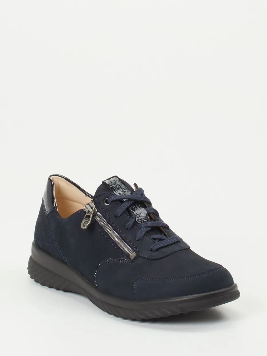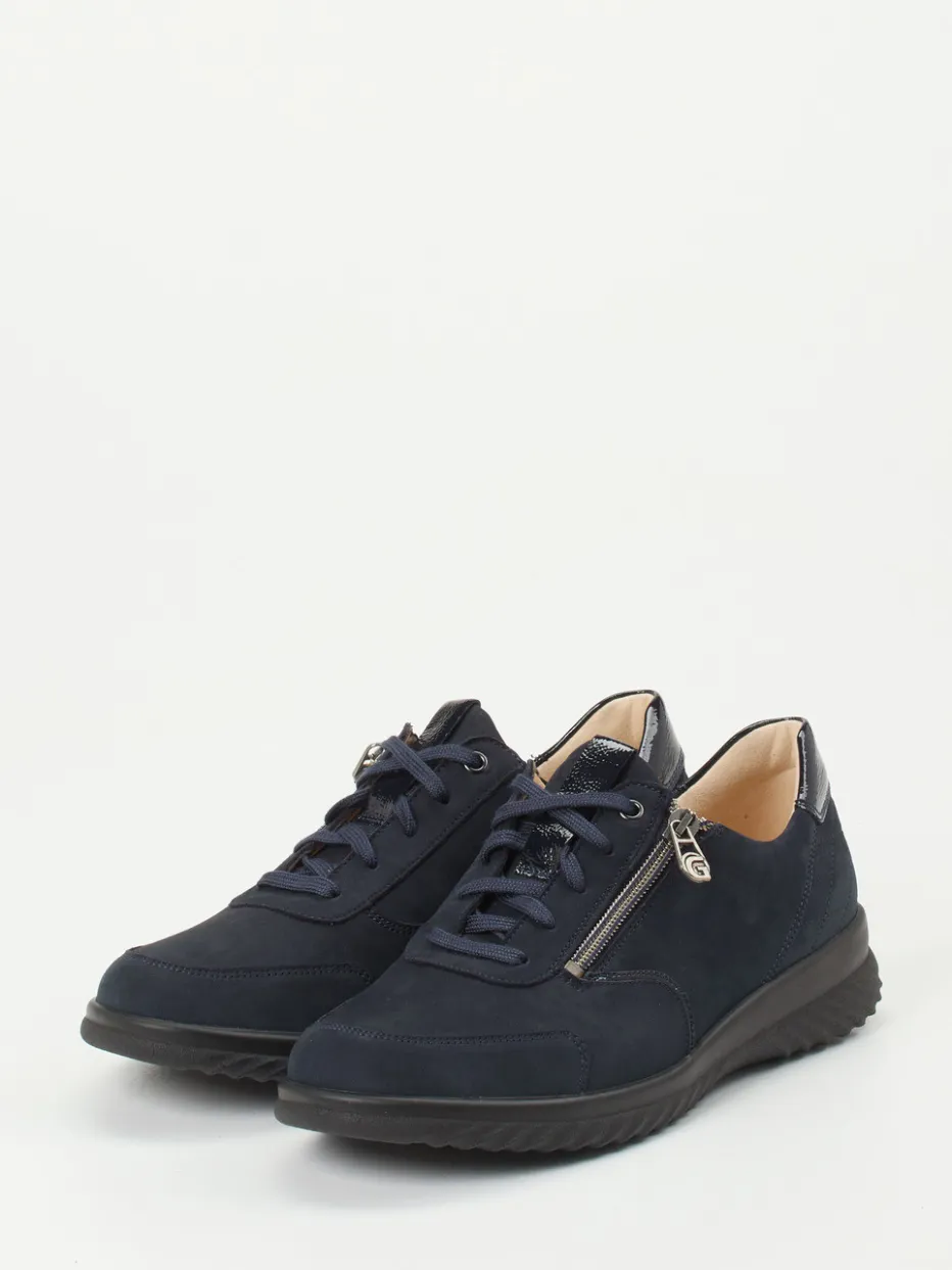Stilvoll durch den Alltag.Ganter präsentiert mit diesem Damen-Komfort-Sneaker ein durchdachtes Modell für entspannte Tage. Der Schuh erfüllt höchste Ansprüche an Komfort und verbindet dunkelblaues, samtig angeschliffenes Kalbleder mit dezenten Lackdetails an Zunge und Ferse. Die klassische, runde Form wird durch eine Schnürung plus silberfarbenen Reißverschluss ergänzt. Innen sorgt pflanzlich gegerbtes Lederfutter mit austauschbarem Korkfußbett für Bequemlichkeit. Die flexible und rutschhemmende Gummisohle fördert ermüdungsfreies Gehen im Alltag. Subtile Glanzakzente und minimalistisches Design unterstreichen den Quiet-Luxury-Charakter. Ein komfortbetonter Sneaker mit hochwertiger Verarbeitung – typisch Ganter.