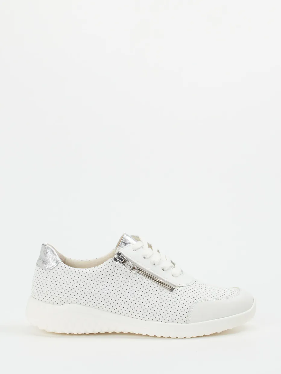Leichter Begleiter an warmen Tagen.Solidus präsentiert mit diesem Komfort-Sneaker einen stilvollen Alltagsbegleiter für Damen. Ob Stadtbummel oder entspannter Spaziergang: Das perforierte Kalbleder in Offwhite sorgt in Kombination mit dem anschmiegsamen Leder-/Textilfutter für ein luftiges Tragegefühl. Dezente Glanzeffekte an Ferse und Zunge in Silber verleihen dem rund geformten Modell mit Schnürung und Reißverschluss ein modernes Finish. Die flexible Gummisohle mit Wabenprofil bietet sicheren Halt, während die herausnehmbare Innensohle individuelle Anpassung ermöglicht. Der reduzierte Materialmix verleiht dem Schuh eine minimalistische Anmutung mit Streetwear-Akzent. Solidus steht hier für zuverlässigen Komfort und hochwertige Verarbeitung in zeitgemäßem Design.