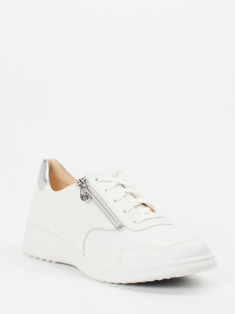 Minimalistisch trifft funktional.Ganter präsentiert mit diesem Damen-Komfort-Sneaker ein Modell aus hochwertigem Kalbleder. Ideal für einen aktiven Tag mit vielen Wegen: Das angenehme Material zeigt eine matt geglättete Oberfläche, ergänzt um eine gesteppte Fersenkappe mit silberfarbenem Besatz. Farblich dominieren Weiß und dezente Grautöne, moderne Akzente setzen Reißverschluss und Details in Metallic. Der klassische, abgerundete Schnitt wird durch eine flexible 4-Punkte-Sohle, gepolsterte Ferse und ein herausnehmbares Fußbett unterstützt. Inspiriert von „Quiet Luxury“ fügt sich der Schuh mühelos in entspannte Alltagslooks ein. Hochwertige Verarbeitung kombiniert mit funktionalem Komfort – typisch Ganter.