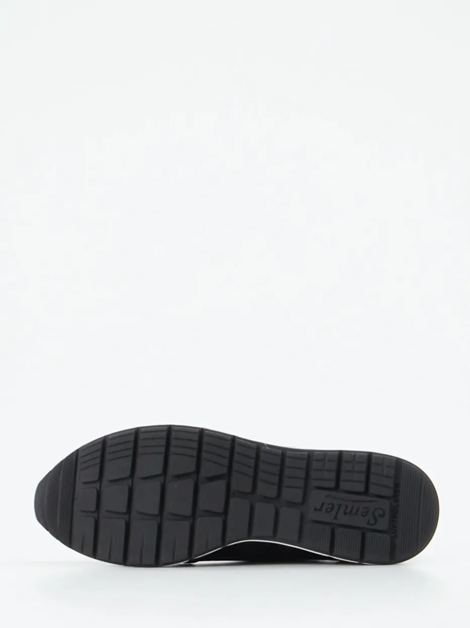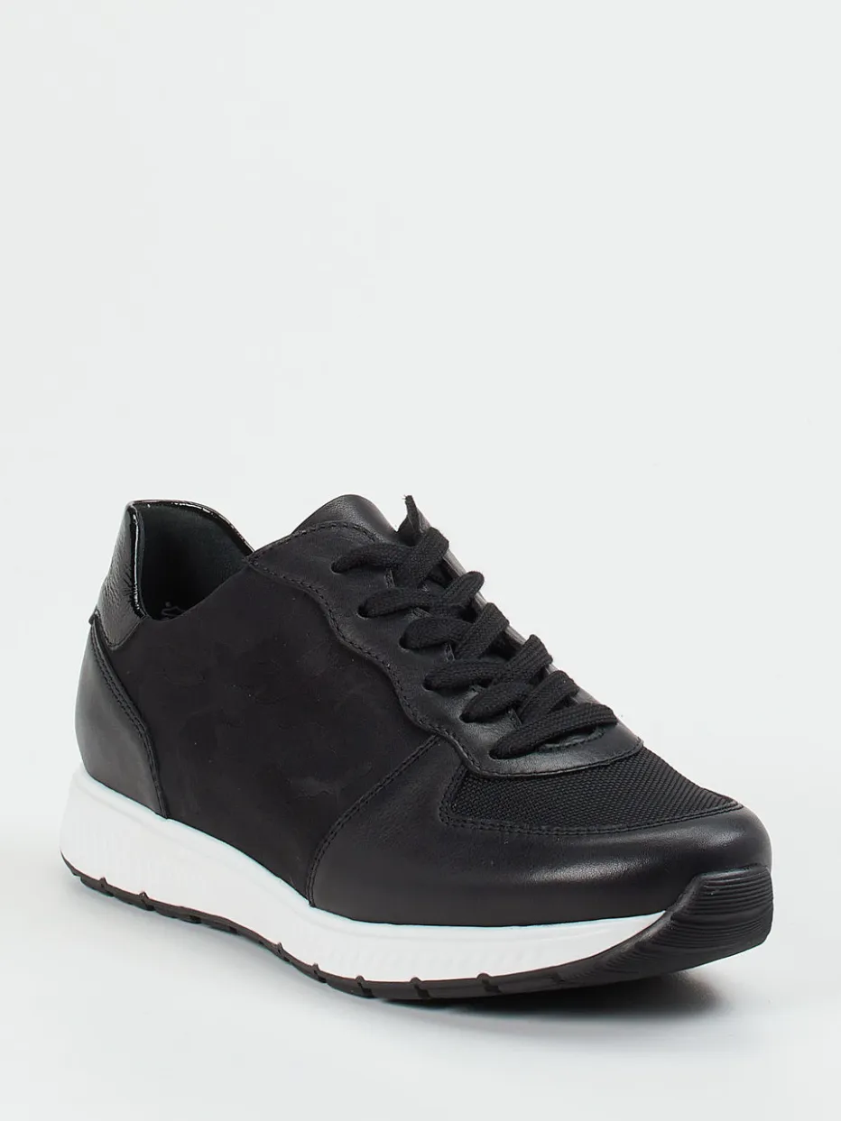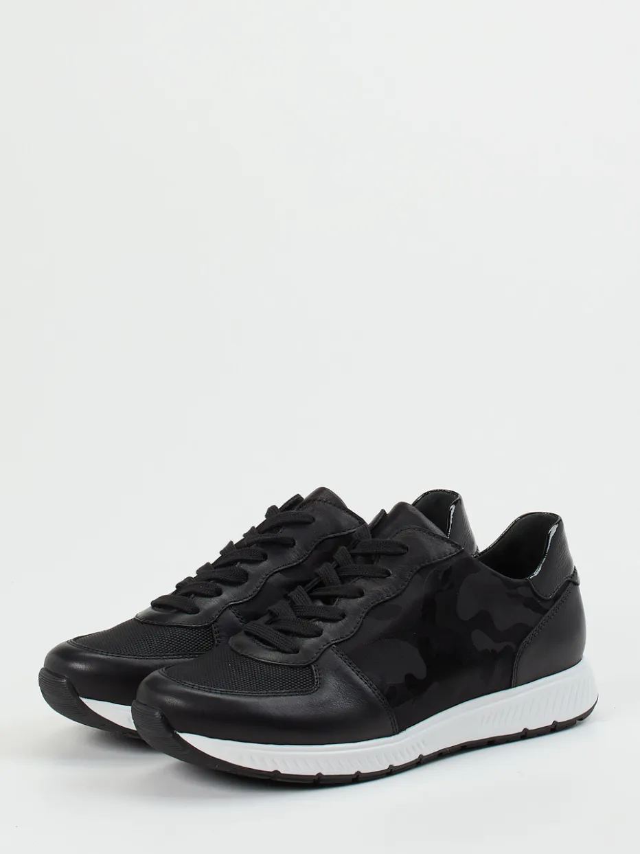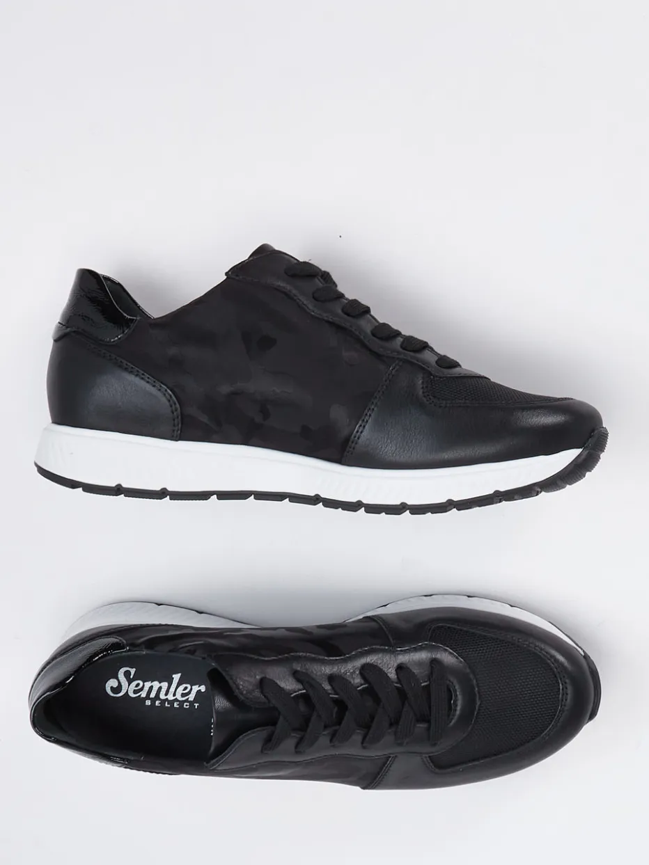 Schwarz trifft Komfort mit Stil.Semler präsentiert diesen Damen-Komfort-Sneaker aus der Bequem-Linie – sportlich interpretiert in klassisch schwarzer Ausführung. Ideal für entspannte Tage, verbindet der Schuh hochwertige Materialien wie schwarzes Kalbleder mit samtigem Mesh und glänzender Lackleder-Fersenkappe. Die klassische Rundform mit toniger Camouflage-Komponente trifft auf funktionale Details wie atmungsaktive Textilflächen, profilierte Zweifarbsohle und herausnehmbare Innensohle. Die Schnürung passt sich optimal an, während das dezente Markenlabel Eleganz signalisiert. Perfekt zu Jogpants oder Funktionsjacken – lässig und citytauglich. Federleichter Tragekomfort mit semler-typischer Fußfreundlichkeit.