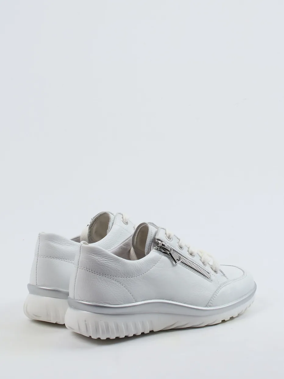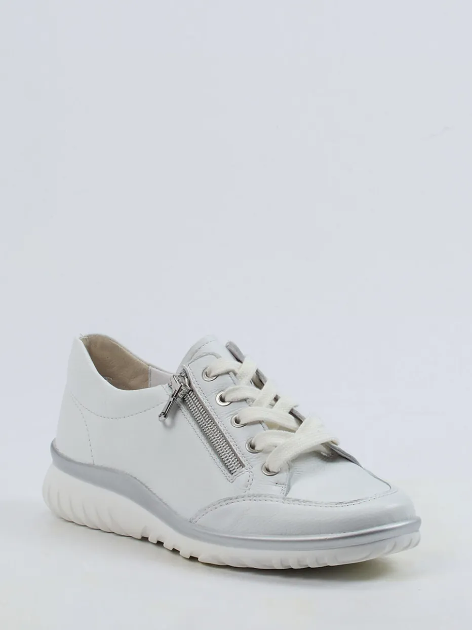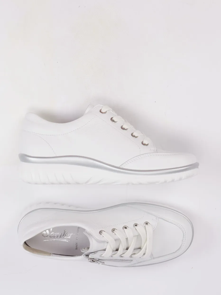 Minimalistisch und funktional.Die Marke Semler präsentiert mit diesem Komfort-Sneaker ein Modell für Damen, das Alltagstauglichkeit elegant interpretiert. Ideal für entspannte Tage auf den Beinen bietet der Schuh dank gepolstertem Wechselfußbett, luftgepolsterter PU-Sohle und angenehmer Weite H ein spürbares Komforterlebnis. Das weiße Kalbleder zeigt sich hochwertig genarbt und wird durch silberne Details wie Reißverschluss und Sohlenkante modisch akzentuiert. Die runde Silhouette mit Schnürung und seitlichem Zip ergänzt den sportiv-eleganten Auftritt. Stilistisch bewegt sich das Modell zwischen Quiet Luxury und funktionalem Chic der Saison. Ein femininer Begleiter mit Fokus auf Komfort und Anspruch.