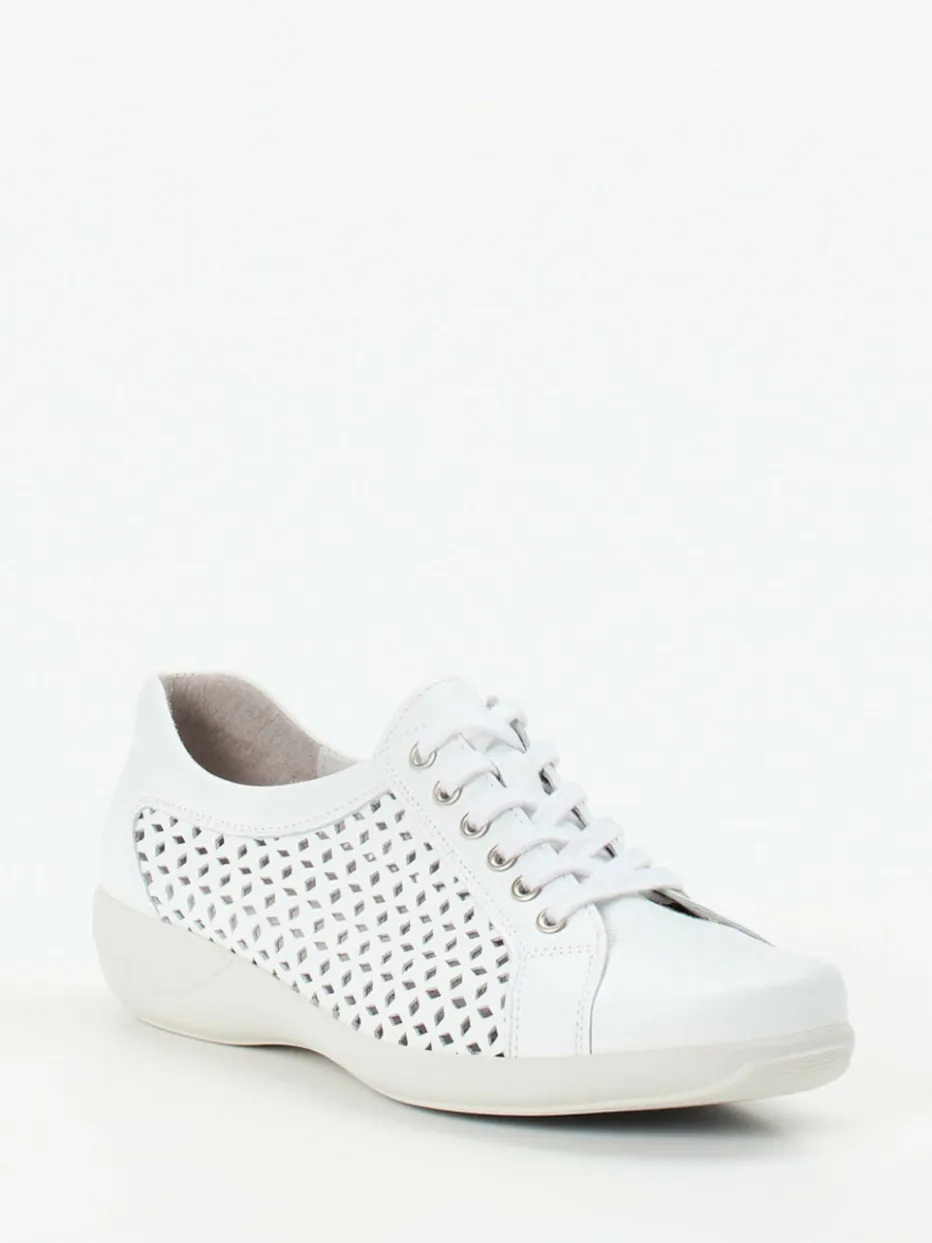 Bequemer Auftritt bei sommerlicher Leichtigkeit.Stuppy präsentiert mit diesem Komfort-Sneaker ein durchdachtes Damenmodell für Freizeit und Alltag. Weiße Kalbleder-Verarbeitung trifft auf funktionale Details wie die perforierten Seitenpartien für ein luftiges Tragegefühl und eine individuell anpassbare Schnürung. Die glänzende Oberfläche, das gepolsterte Futter und metallische Ösen unterstreichen den stilvollen Minimalismus. Die ergonomisch geformte Gummisohle bietet mit 2 cm Absatz rutschhemmende Stabilität – ideal für entspannte Spaziergänge. Besonders passend zu leichten Sommerhosen oder Poloshirts. Stuppy steht hier für kompromisslosen Komfort mit klarer Linienführung und saisonaler Ausstrahlung.