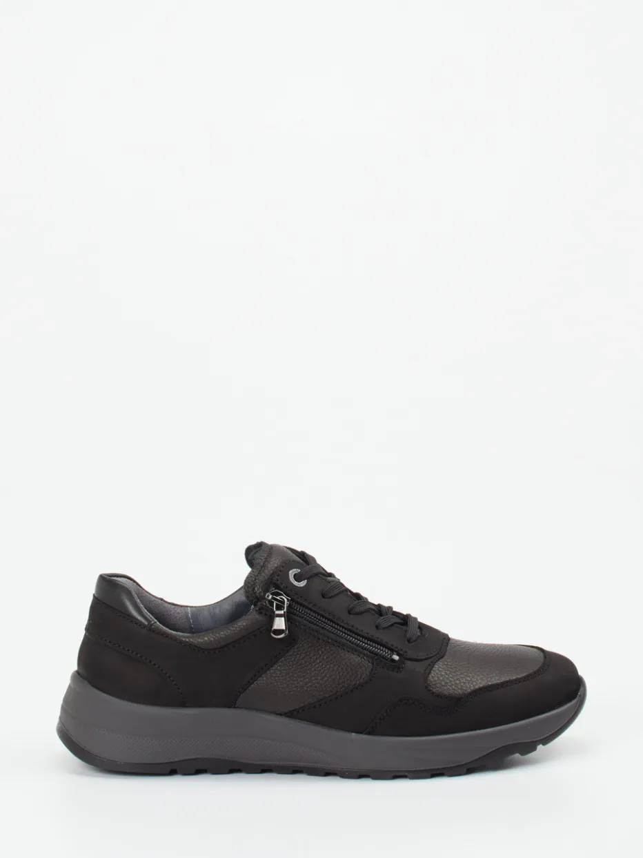Schwarzer Komfort-Sneaker mit hochwertigem Kalbleder und seitlichem Reißverschluss – perfekt für entspannte Alltagslooks mit Funktion und Stil.