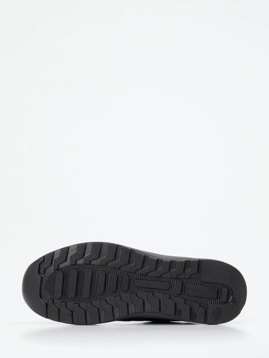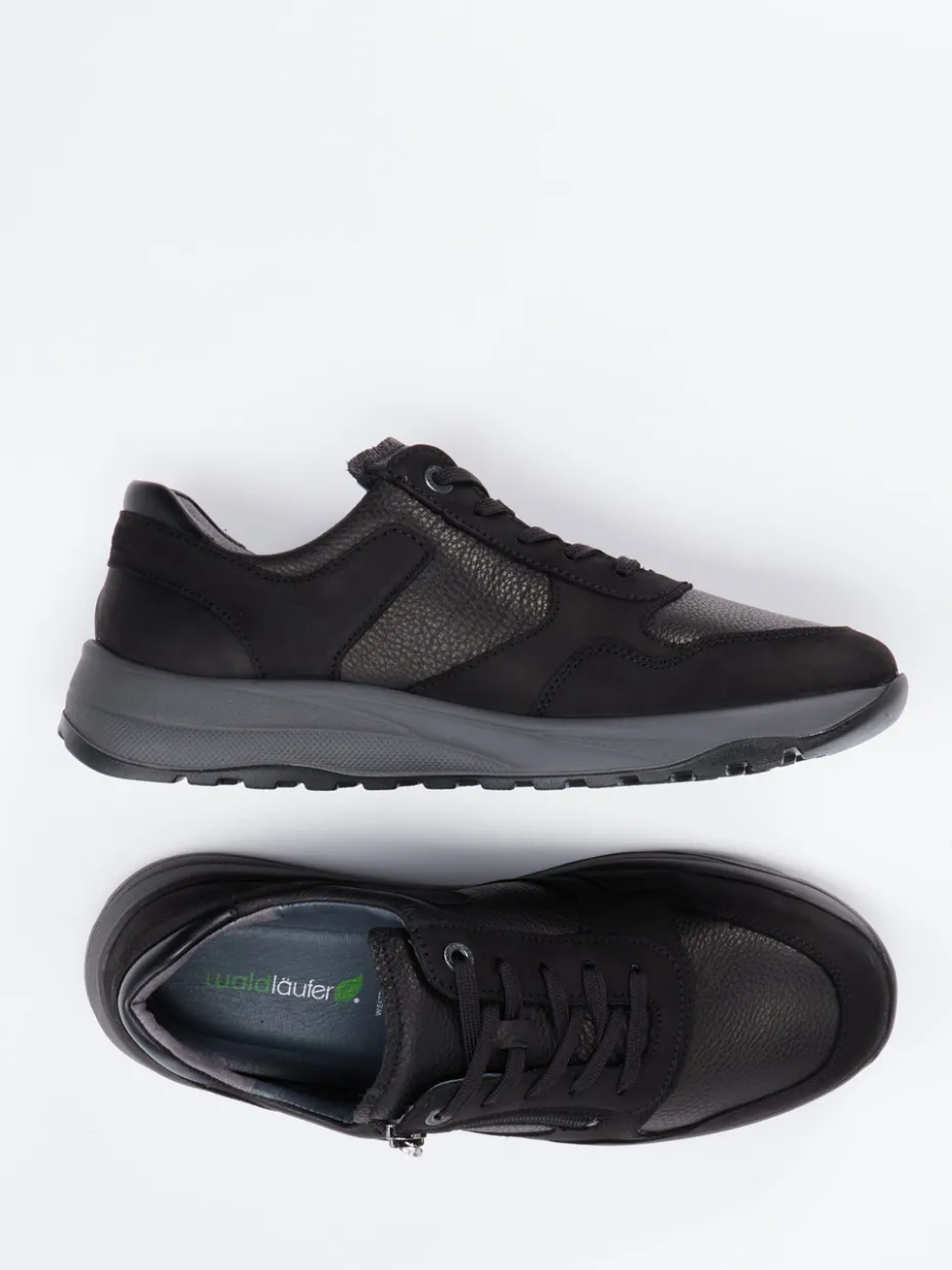 Viel Komfort in minimalistischem Design.Waldläufer zeigt hier einen Schnürschuh aus der Komfortlinie für Damen. Ideal für tägliche Wege – dieser Sneaker verbindet die elegante Schlichtheit schwarzen Kalbleders mit samtig genarbten Nubukakzenten und einem praktischen seitlichen Reißverschluss. Die klassisch gerundete Form, die tonal abgestimmten Nähte und die rutschfeste Sohle unterstreichen den lässigen Charakter. Ein weich gepolsterter Einstieg und das herausnehmbare Fußbett runden die alltagstaugliche Funktionalität ab. Das Modell trifft den aktuellen Comfort-Core-Trend und ergänzt mühelos minimalistisch inspirierte Freizeit-Outfits. Verlässliche Bequemlichkeit in typischer Waldläufer-Qualität.