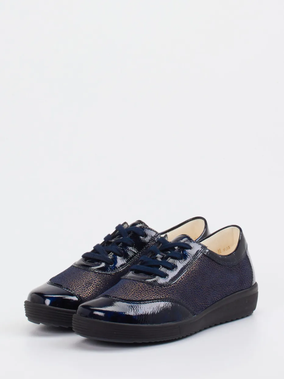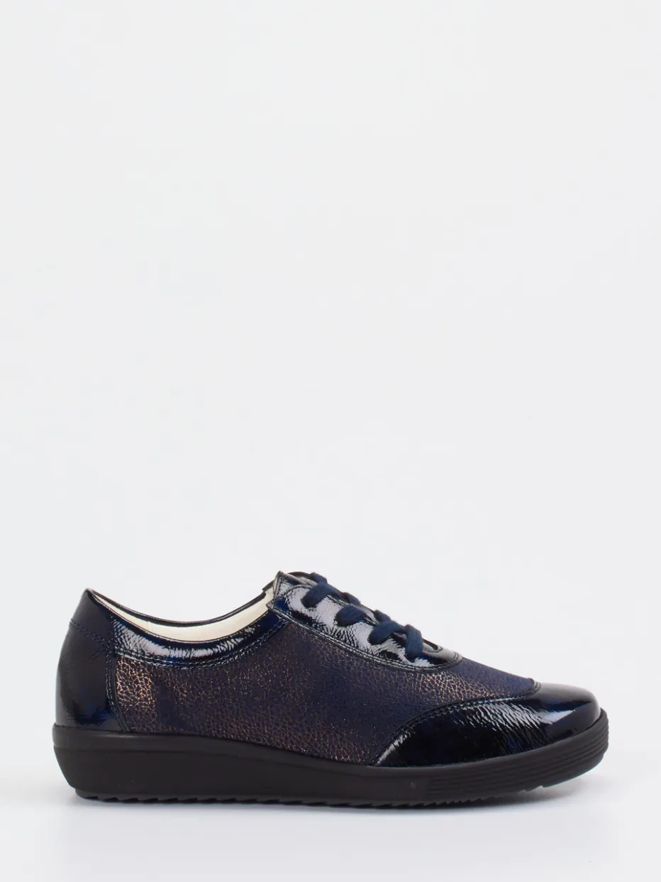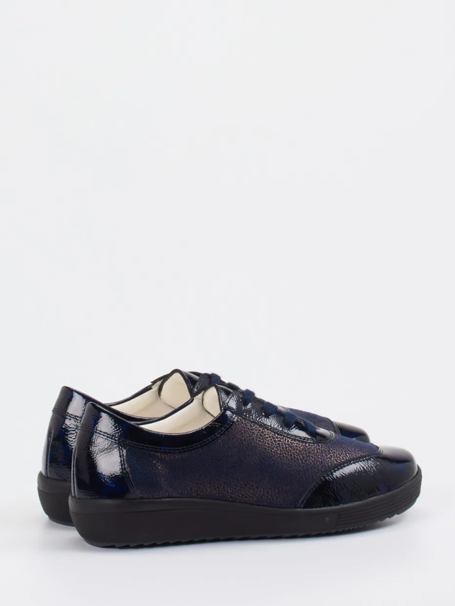 Glänzende Lackdetails treffen auf ergonomischen Tragekomfort – dieser Komfort-Sneaker verbindet stilvolles Design mit alltagstauglicher Funktion und modischem Metallic-Effekt.