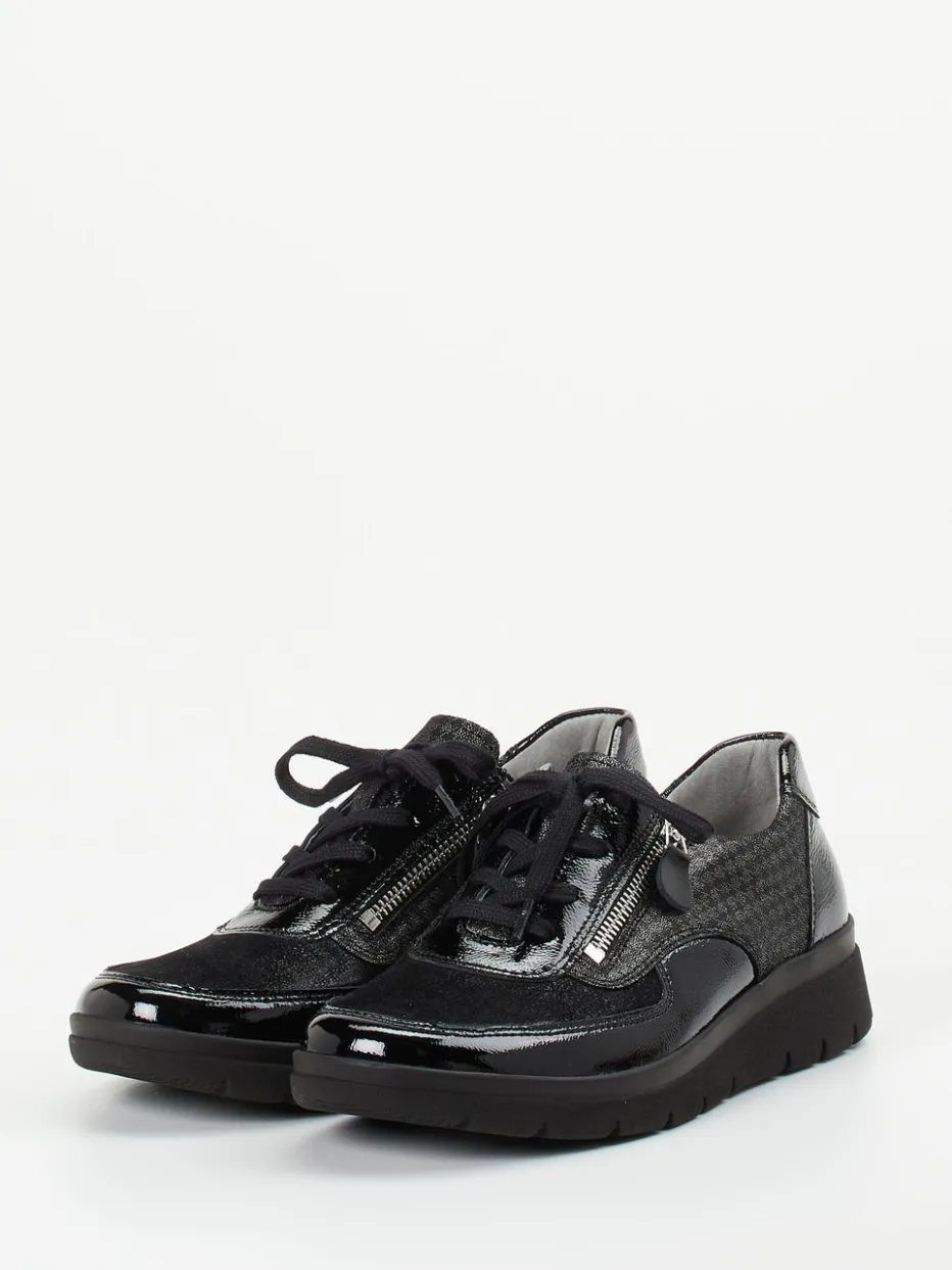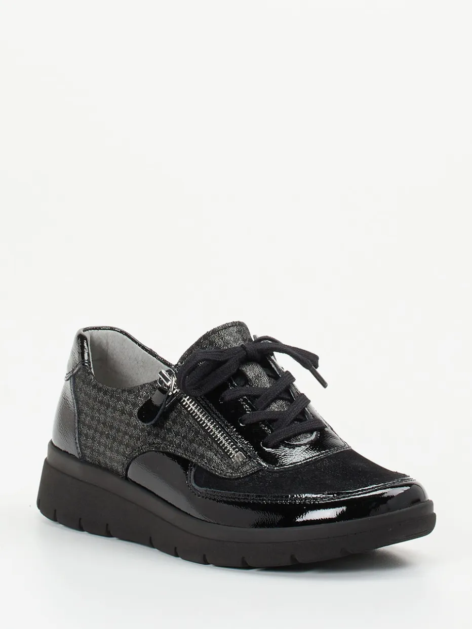 Glanz trifft Komfort im Alltag.Die Marke Stuppy bietet mit diesem Komfort-Sneaker ein durchdachtes Design für Damen. Ob für Büro oder Freizeit – das schwarze Lackleder mit glänzenden Partien und Hahnentrittmuster verleiht dem Modell einen eleganten Streetwear-Akzent. Gepaart mit flexiblem Stretchmaterial und weichem Innenfutter aus Leder und Textil entsteht hoher Tragekomfort. Die silberfarbenen Reißverschlüsse neben der Schnürung erleichtern das An- und Ausziehen. Eine profilierte Gummisohle mit leichtem Keilabsatz bietet Grip und Alltagstauglichkeit. Der Materialmix mit Karomuster liegt im Trend. Stuppy steht für kompromisslose Bequemlichkeit mit stilvollem Anspruch.