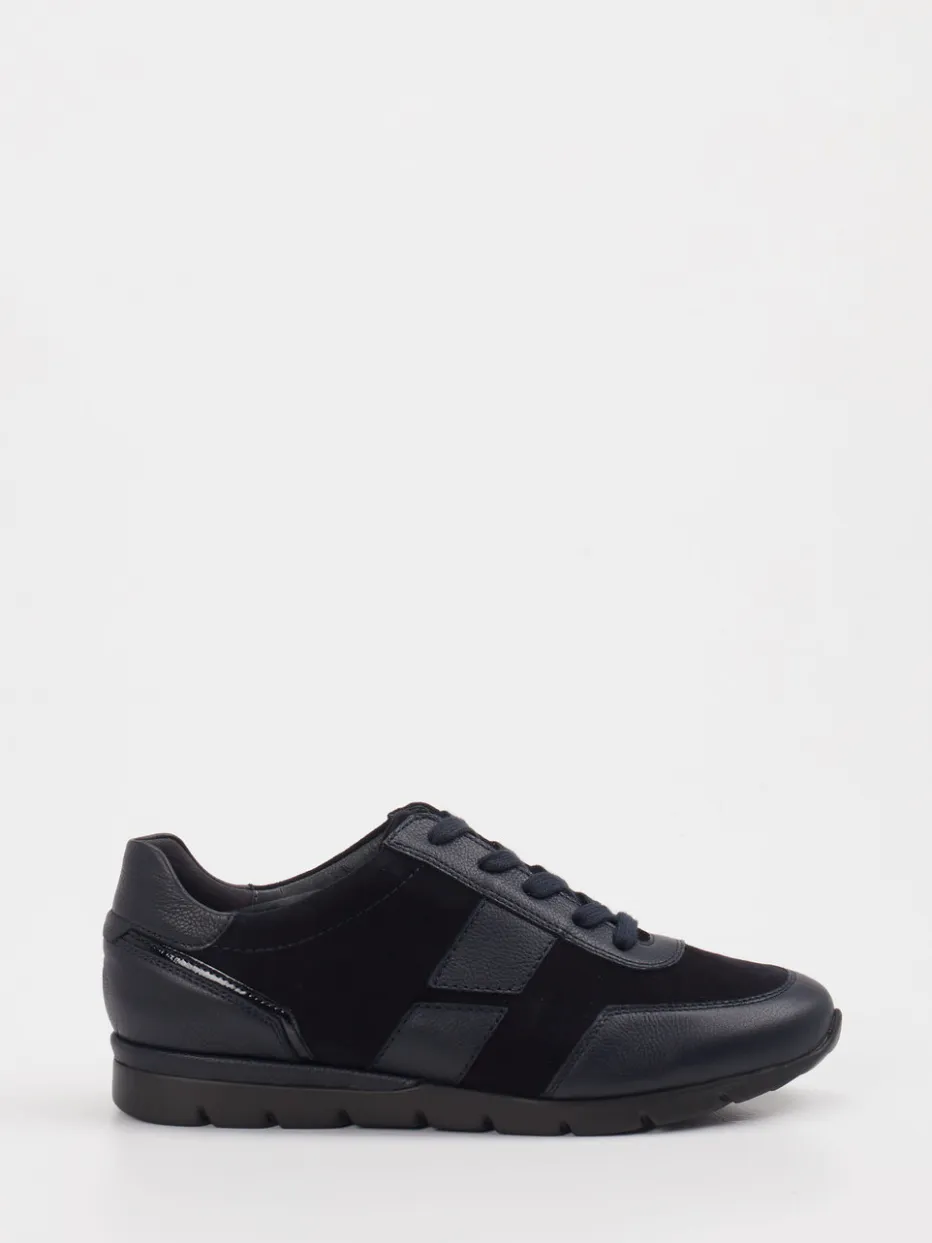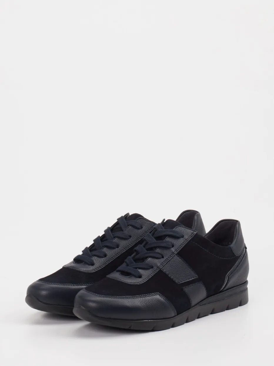 Komfort trifft zurückhaltende Eleganz. Semler zeigt mit diesem Komfort-Sneaker für Damen ein Modell, das durch seine durchdachte Materialkombination und alltagstaugliche Optik überzeugt. Die Kombination aus samtigem Veloursleder und glattem Leder verleiht dem Obermaterial eine elegante Struktur. Der Ton-in-Ton gehaltene Dunkelblau-Ton unterstreicht den minimalistischen Look. Mit flacher Silhouette, profilierter PU-Sohle und bequemer Weite H bietet der Sneaker hohen Tragekomfort – besonders im Alltag oder beim Entspannen zu Hause. Die klassische Schnürung sorgt für optimale Anpassung. Stilistisch passt das Modell perfekt zu urbanen Quiet-Luxury-Looks der Saison. Persönliche Wohlfühlmomente mit handwerklicher Leichtigkeit – typisch Semler.