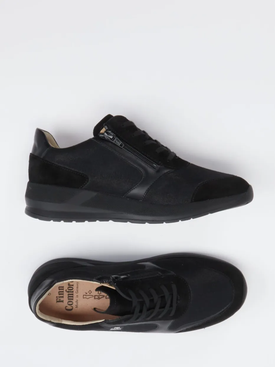 Ob beim Spaziergang durch die Stadt oder bei entspannten Stunden daheim – dieser Sneaker überzeugt mit weichem Leder-/Textilfutter, einer griffig profilierten PU-Sohle und einem attraktiven Mix aus samtigem Veloursleder und glattem Leder. Der seitliche Reißverschluss ergänzt die klassische Schnürung funktional. Schwarzer Ton-in-Ton-Look, gepolsterter Schaftrand und ergonomisches Fußbett unterstreichen die minimalistische Streetwear-Anmutung im Comfort-Core-Trend. Perfekt zu Jogpants oder soften Casual-Outfits.