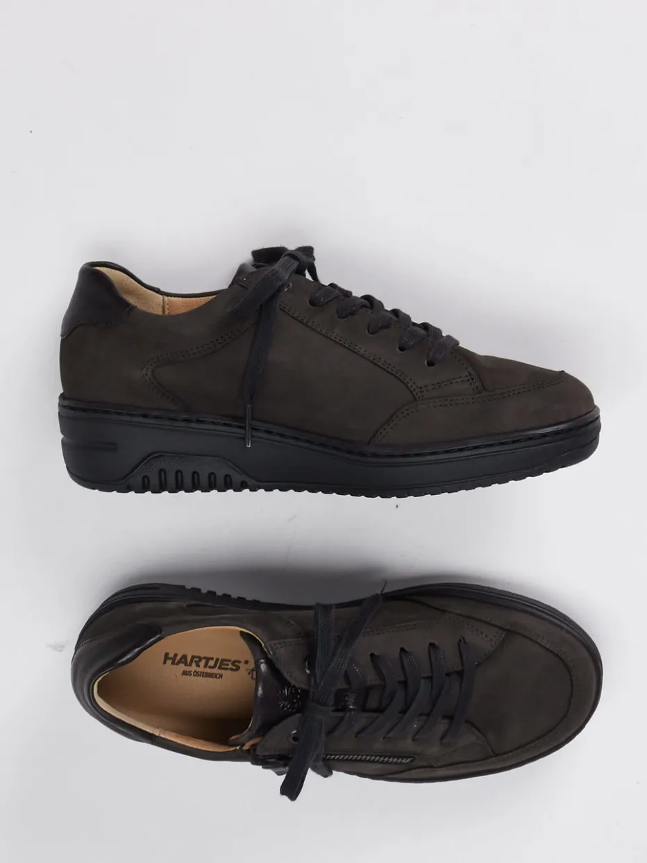 Bequemer Stil für jeden Tag.Hartjes präsentiert einen Komfort-Sneaker, der Alltagstauglichkeit und Design gekonnt verbindet. Dieses Modell ist wie gemacht für lange Tage voller Bewegung. Gefertigt aus hochwertigem Nubukleder, samtig matt strukturiert, bietet es eine anthrazitgraue Ton-in-Ton-Optik mit klassisch-runder Silhouette. Schnürung und ein seitlicher Reißverschluss sorgen für präzisen Sitz und bequemes An- und Ausziehen. Die ergonomische, profilierte Gummisohle mit herausnehmbarer Innensohle verspricht Dämpfung und Stabilität. Inspiriert vom „Comfort Core“-Trend eignet sich der Schuh hervorragend für lässig-komfortable Outfits mit Jeans oder Funktionsjacke. Ein Hartjes-Modell mit funktionaler Leichtigkeit und stilvoller Zurückhaltung.