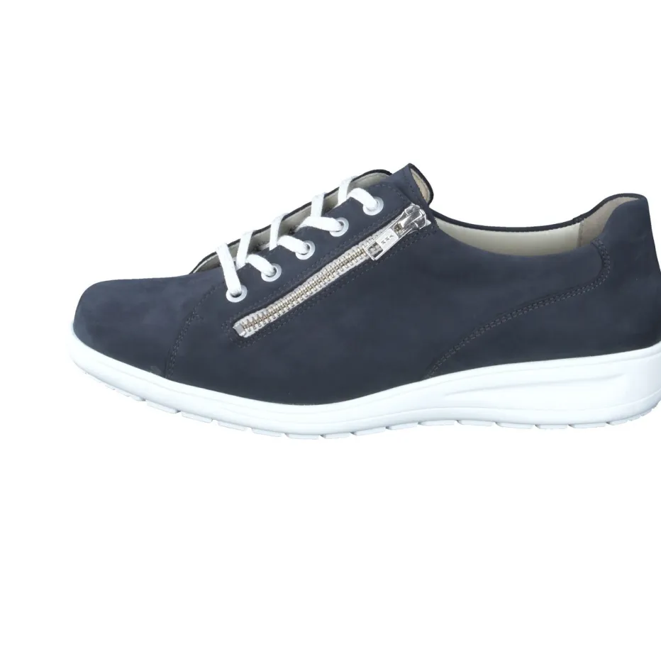 Stilsicher durch jeden Alltag.Solidus präsentiert einen Damen-Komfort-Sneaker, der Schlichtheit und Funktion clever vereint. Ideal für entspannte Alltagsmomente oder gemütliche Stadtbummel: Das handschuhweiche Nubukleder mit matter Oberfläche wird durch glitzernde Lurexfäden in der weißen Schnürung stilvoll ergänzt. Dunkelblau trifft auf klare Linien und silberfarbene Elemente wie den funktionalen Reißverschluss. Innen sorgt ein lederbezogenes Luftpolster-Fußbett für spürbaren Komfort, unterstützt durch die weiße Gummisohle in dezenter Keilform. Der cleane Look mit minimalistischem Einfluss harmoniert mit casual Outfits wie Jeans und Softshelljacke. Für komfortbetonte Mode mit hochwertigem Designanspruch.