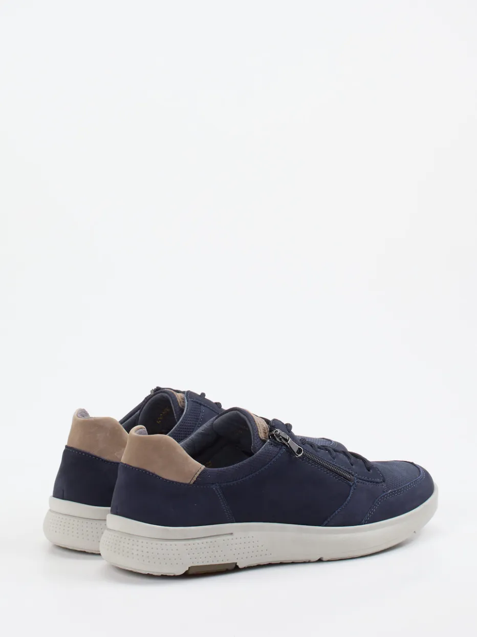 Ideal für entspannte Freizeitstunden bietet das Modell ein Obermaterial aus Nubukleder, samtig angeschliffen und in markantem Dunkelblau. Beige Kontrastbesätze an der Ferse und helle Gummisohlen schaffen dezente Highlights im Ton-in-Ton-Design. Die Kombination aus Schnürung und seitlichem Reißverschluss erleichtert den Einstieg, während das gepolsterte Innenfutter den Fuß angenehm umschließt. Inspiriert von aktuellen Streetwear-Trends, punktet der Schuh mit funktionalem Komfort und stilistischer Zurückhaltung. Besonders passend zu Chinohose oder Funktionsjacke.