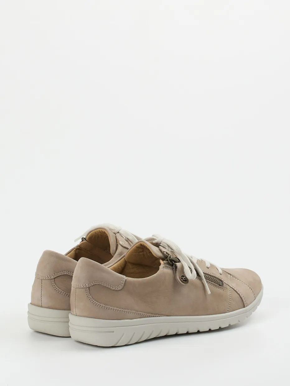 Ob auf alltäglichen Wegen durch die Stadt oder beim entspannten Wochenendspaziergang – das beigegraue Nubukleder, samtig angeschliffen und matt veredelt, bietet ein angenehm weiches Tragegefühl. Die Kombination aus Schnürung und seitlichem Reißverschluss in Altgoldoptik erleichtert das Anziehen, während gepolsterter Einstieg und herausnehmbares Lederfußbett Ergonomie betonen. Optisch abgerundet wird die cleane Silhouette durch Ton-in-Ton-Nähte und eine hellgraue Gummisohle mit Strukturprofil. Der Look passt ideal zu soft-neutralen Styles und casual Outfits.