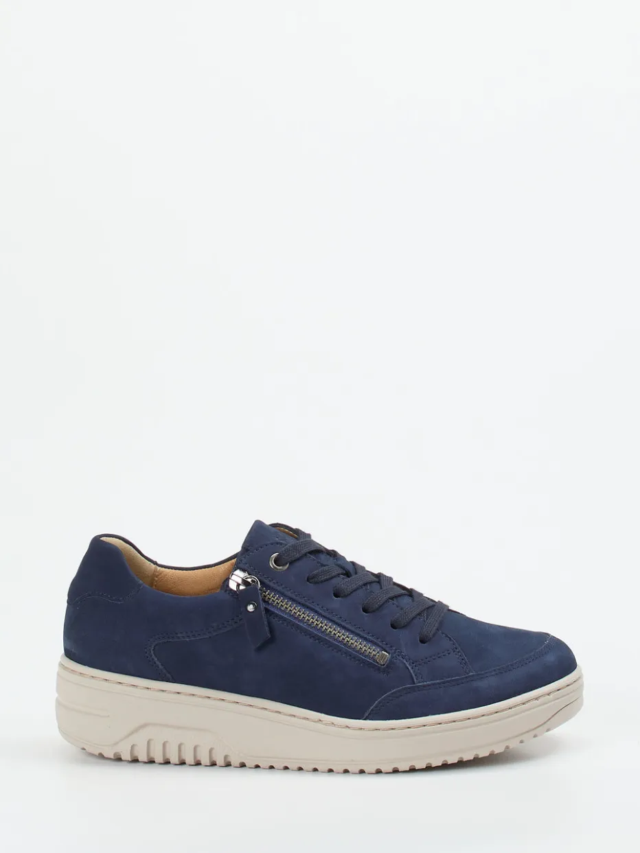 Samtig angeschliffenes Nubukleder in Marineblau trifft auf eine klassisch-runde Form mit silberfarbenem Reißverschluss und Ton-in-Ton-Nähten. Die Kombination aus Schnürung und seitlichem Zipper erleichtert das An- und Ausziehen. Die extraweiche, stoßdämpfende Gummisohle sorgt für ein angenehmes Laufgefühl, unterstützt durch ein herausnehmbares Fußbett. Minimalistische Designakzente und eine rutschhemmende Profillaufsohle runden den sportiv-eleganten Look ab. Ideal zu soften Casual-Outfits in Monochrom-Optik.