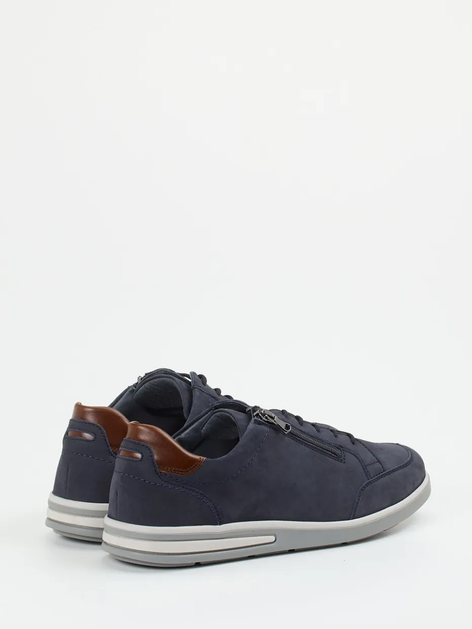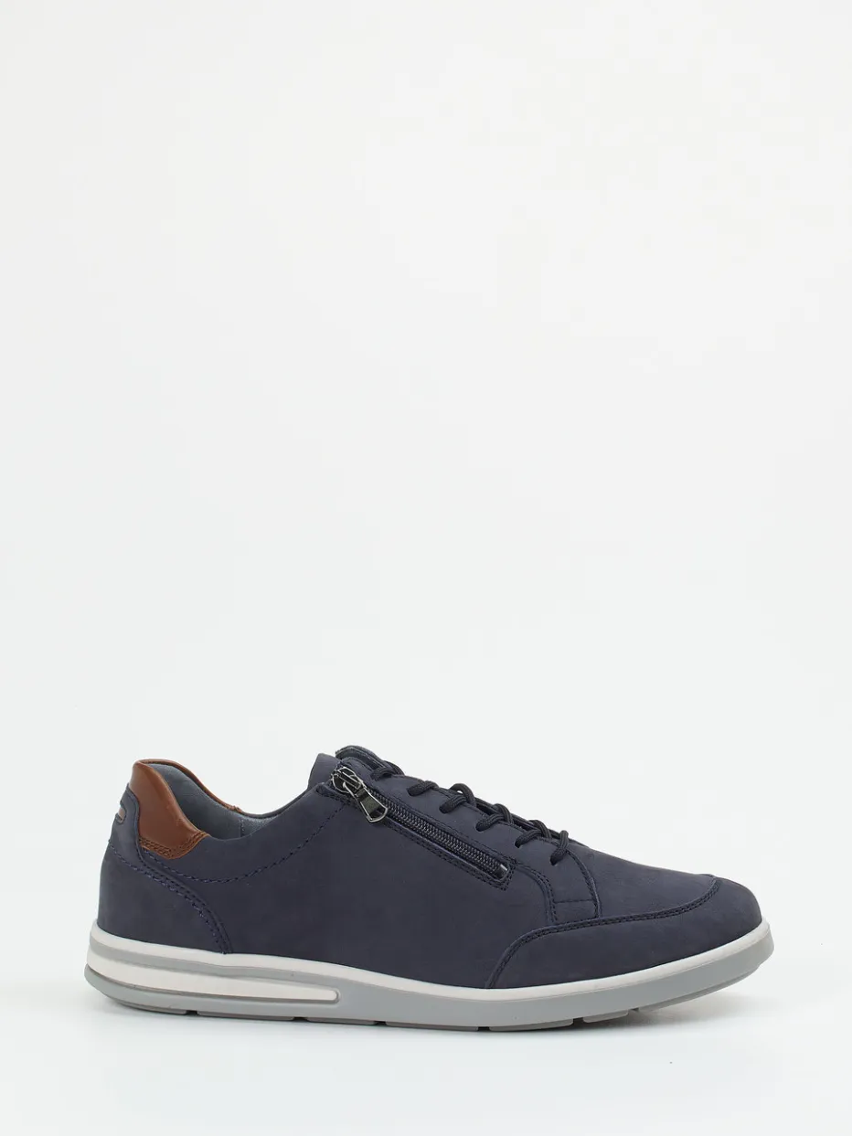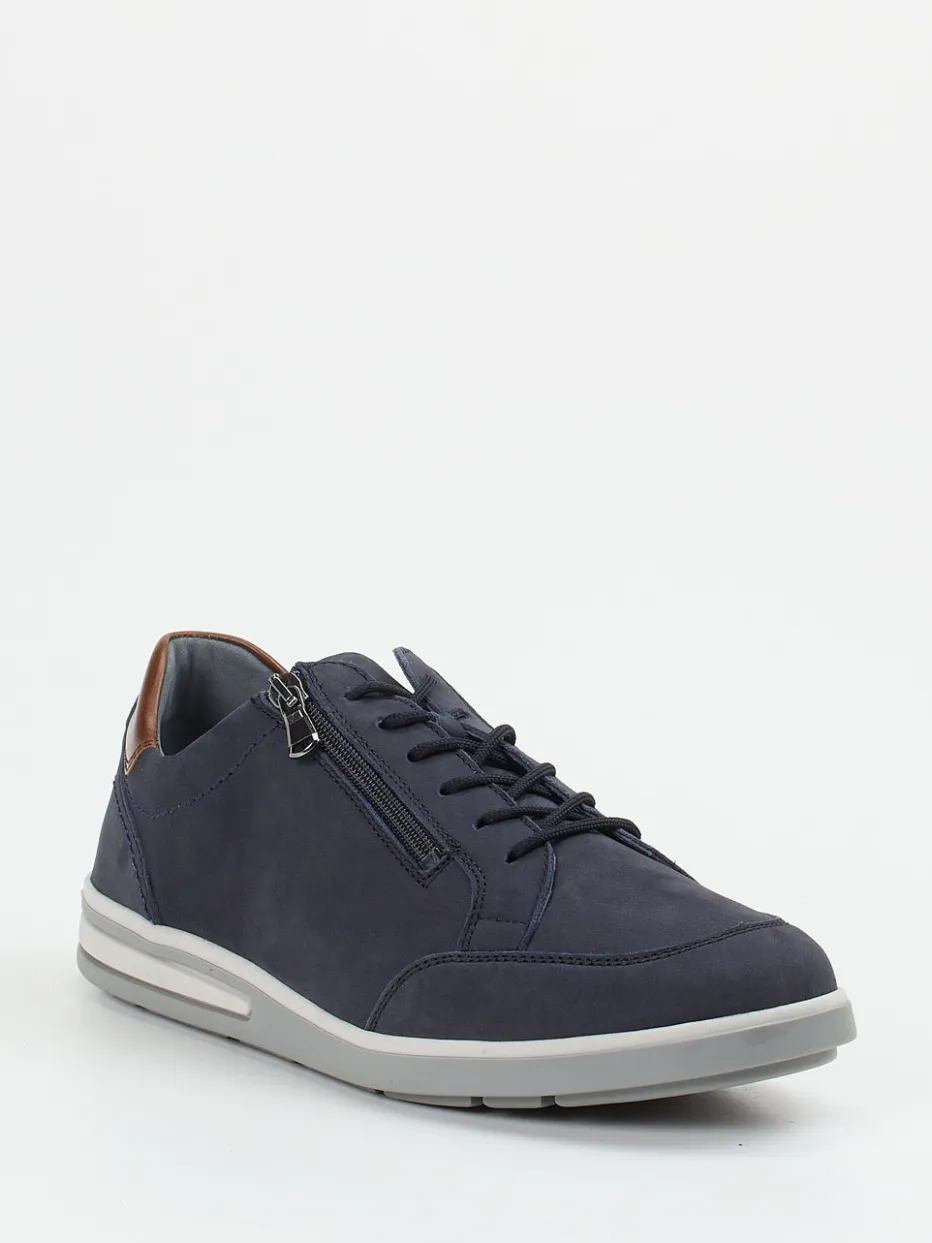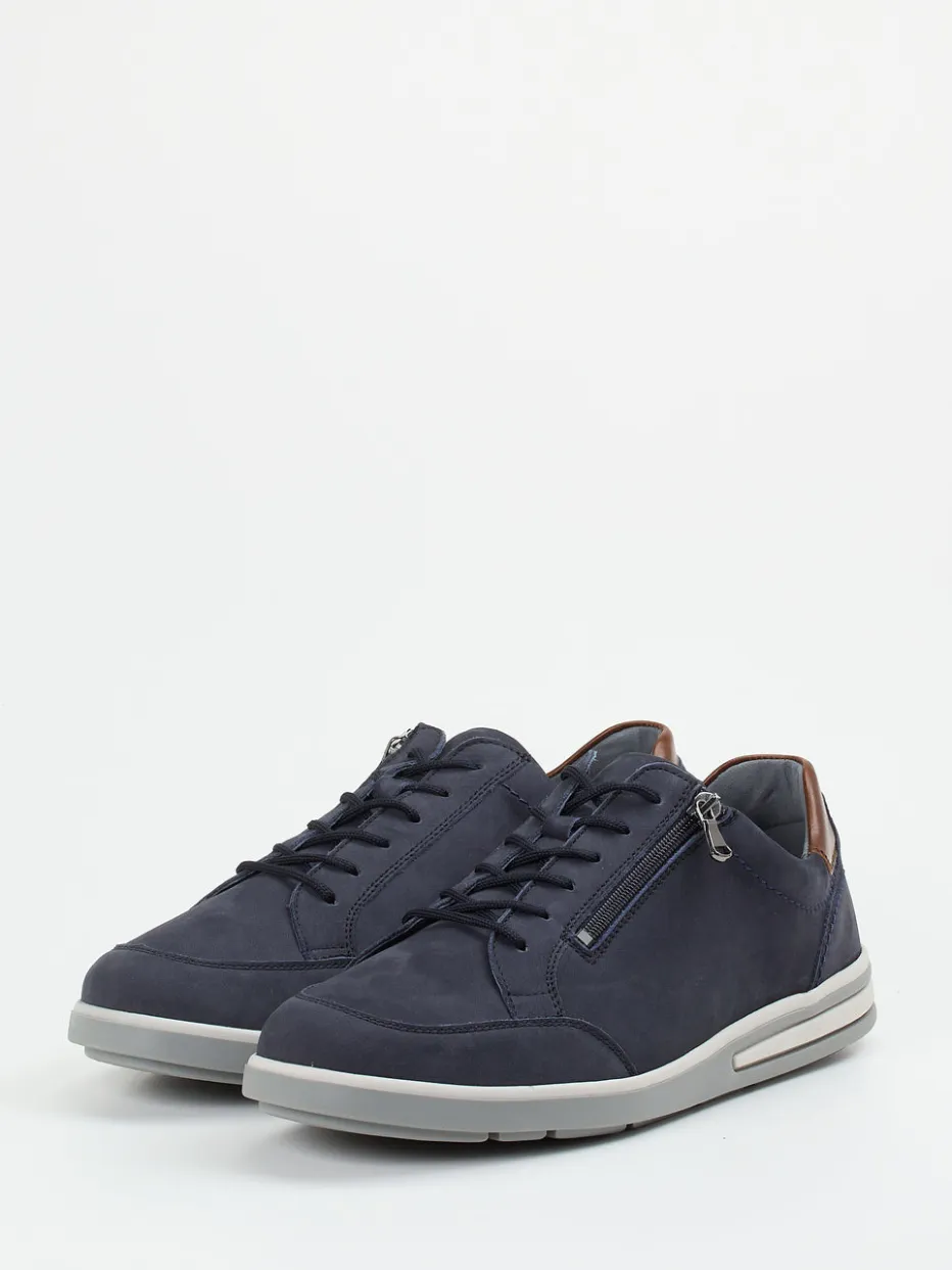 Ideal für lange Tage unterwegs – das Nubukleder erscheint samtig angeschliffen in tiefem Nachtblau und wird an der Ferse von nussbraunem Glattleder akzentuiert. Die klassische, niedrig geschnittene Silhouette kombiniert Schnürung mit praktischem Reißverschluss für bequemes Hineinschlüpfen. Der weich gepolsterte Schaftrand, eine rutschfeste Gummisohle und die großzügige Weite K unterstreichen die komfortorientierte Ausrichtung. Ein Modell, das Casualwear smart ergänzt.