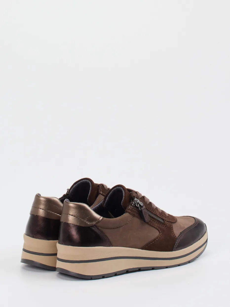 Alltag trifft auf stilvolle Leichtigkeit.Cypres Soft bietet mit diesem Damen-Komfort-Sneaker eine gelungene Verbindung aus Design und Funktion. Ideal für entspannte Alltagsmomente bietet der Schuh eine sportlich-runde Silhouette mit praktischem Reißverschluss. Das Nubukleder wirkt dank der samtigen Oberfläche hochwertig und wird durch glänzende Metallic-Einsätze an Zehenkappe und Ferse modern ergänzt. In warmem Schokobraun gehalten, betonen Ton-in-Ton-Nähte und der Materialmix aus matten und glänzenden Partien das ausgewogene Design. Die dämpfende Keilsohle und Weite H sorgen für angenehmen Tragekomfort, auch bei längeren Wegen. Stilistisch passt der Sneaker zu casual Jeans-Looks und herbstlichen Layering-Outfits. Mit durchdachtem Komfort und trendigen Details ist dieser Sneaker ein vielseitiger Begleiter aus dem Hause Cypres Soft.
