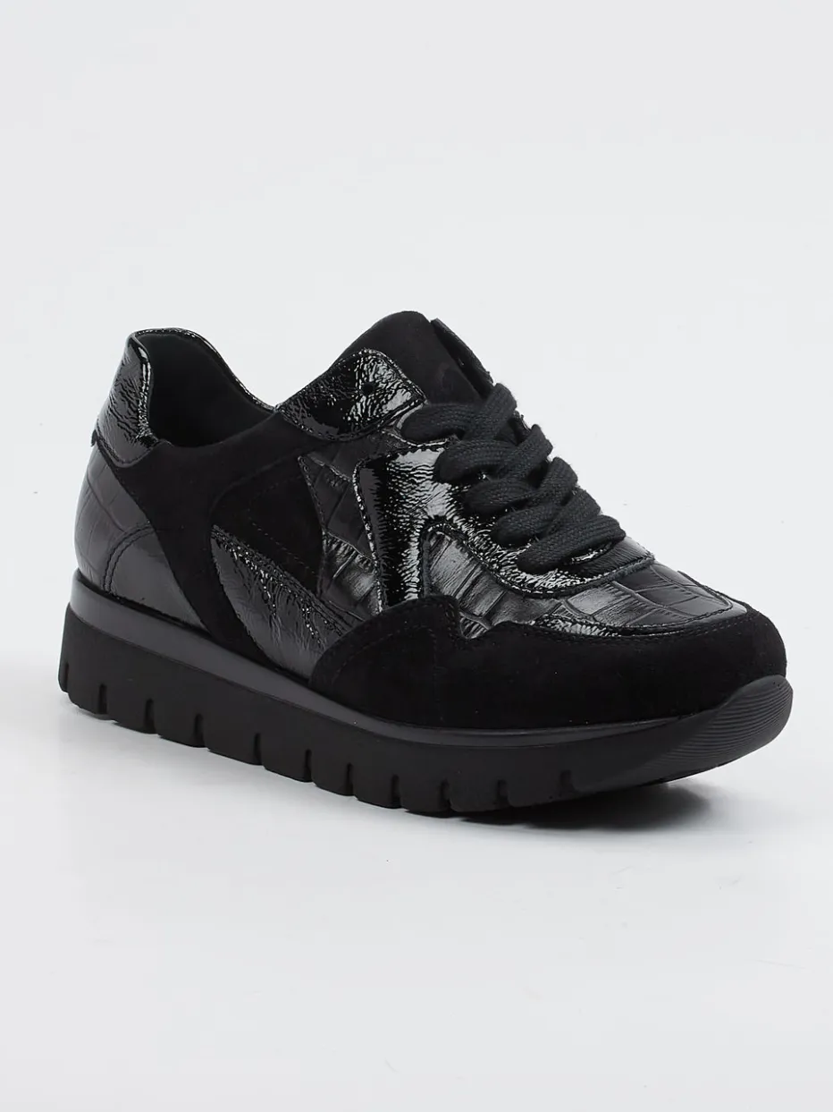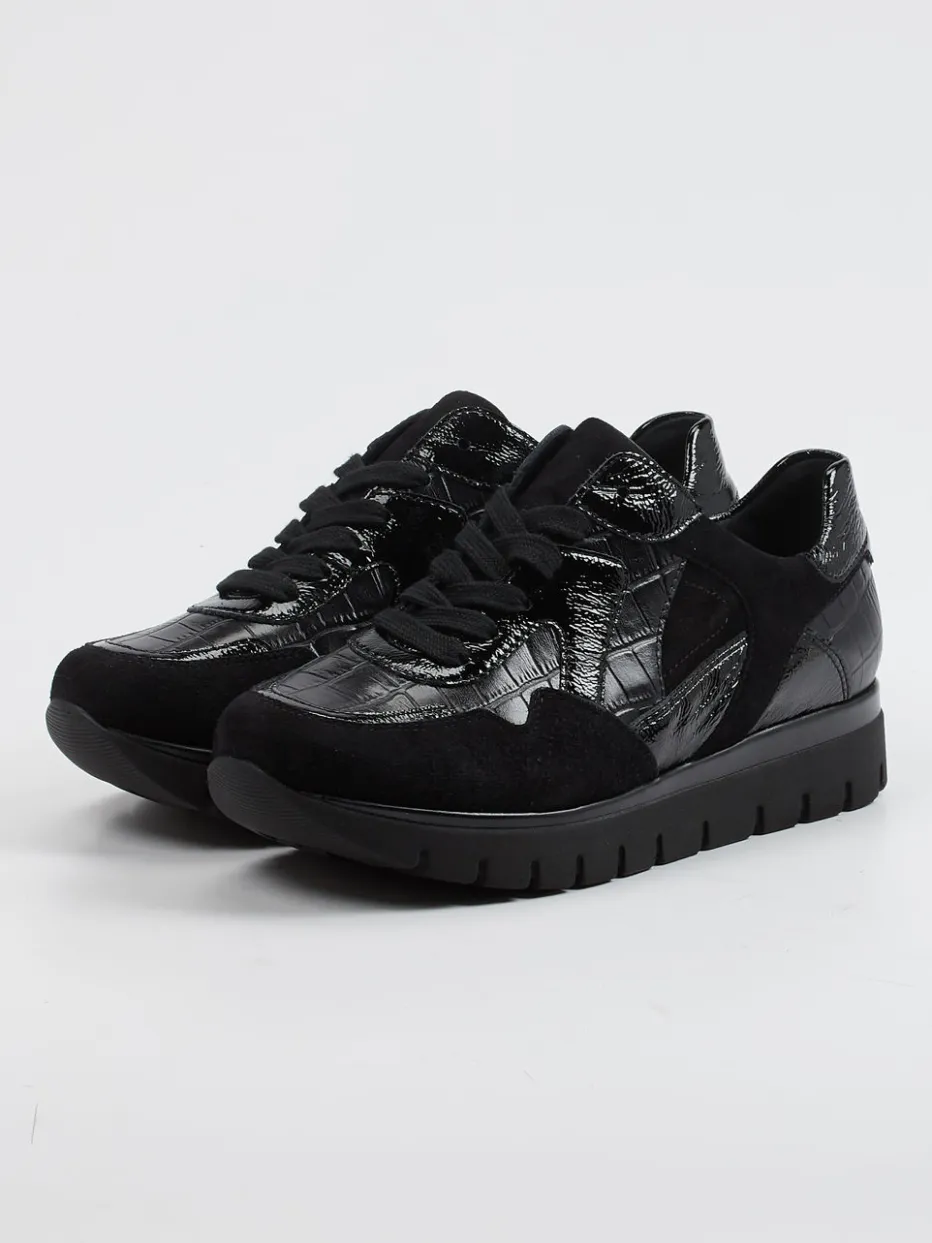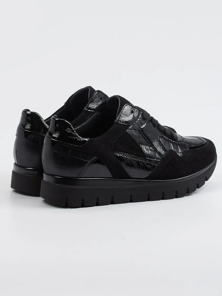 Eleganter Komfort im Ton-in-Ton-Look.Semler präsentiert diesen schwarzen Komfort-Sneaker für Damen mit stilvoller Krokoprägung und bequemer Ausstattung. Ideal für lange Tage im Büro oder entspannte Stadtgänge – das Modell bietet durch die Kombination aus hochwertigem Reptilleder mit glänzender Krokostruktur und mattem Veloursleder angenehmen Tragekomfort. Die klassische runde Form, breite Schnürung und profilierte PU-Sohle mit Luftpolster garantieren Trittsicherheit und Stabilität. Texturkontraste und tonale Schwarznuancen betonen einen eleganten Streetwear-Stil im Sinne des Quiet Luxury. Dank herausnehmbarem Fußbett auch für Einlagen geeignet. Starke Funktion trifft auf urbane Linienführung mit Anspruch an Stil und Qualität.