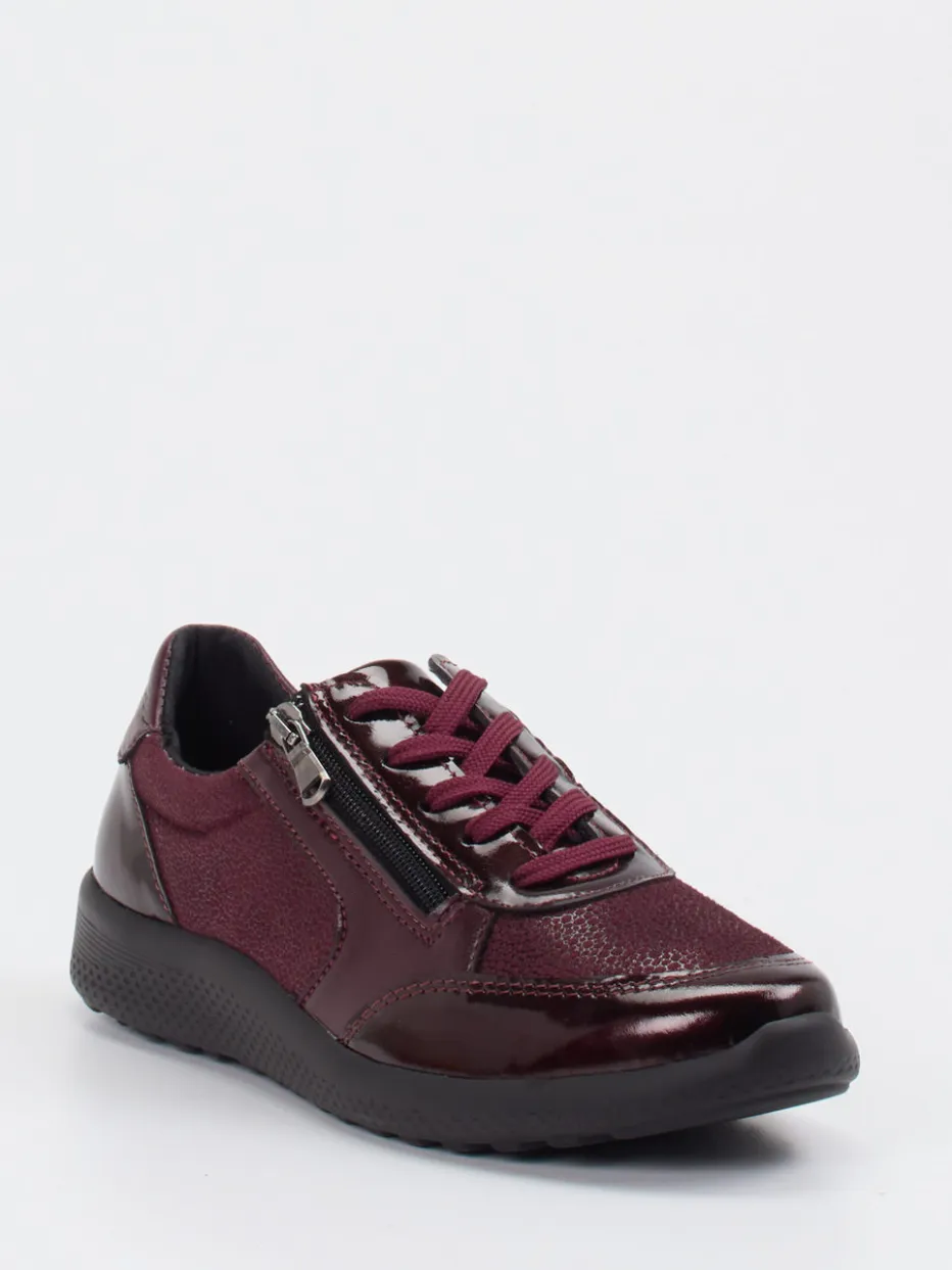 Viel Komfort, harmonisch gestaltet.Cypres Soft präsentiert mit diesem Komfort-Sneaker für Damen ein Modell, das sich ideal für den Alltag eignet. Die Verbindung von flexiblem Stretch-Material mit samtigem Veloursleder und glänzenden Lacklederdetails erzeugt eine ausgewogene Balance zwischen Bequemlichkeit und dezenter Eleganz. Das tiefe Bordeaux bringt Wärme und Stil in das minimalistische Design, während Reißverschluss und Schnürung einen praktischen, leichten Einstieg ermöglichen. Die flache PU-Sohle mit ergonomischem Aufbau fördert entspanntes Gehen, besonders bei längeren Strecken. Optimal zu legeren Outfits wie Stretchhosen oder Komfort-Jeans kombinierbar. Cypres Soft steht für funktionale Passform mit modischer Raffinesse.