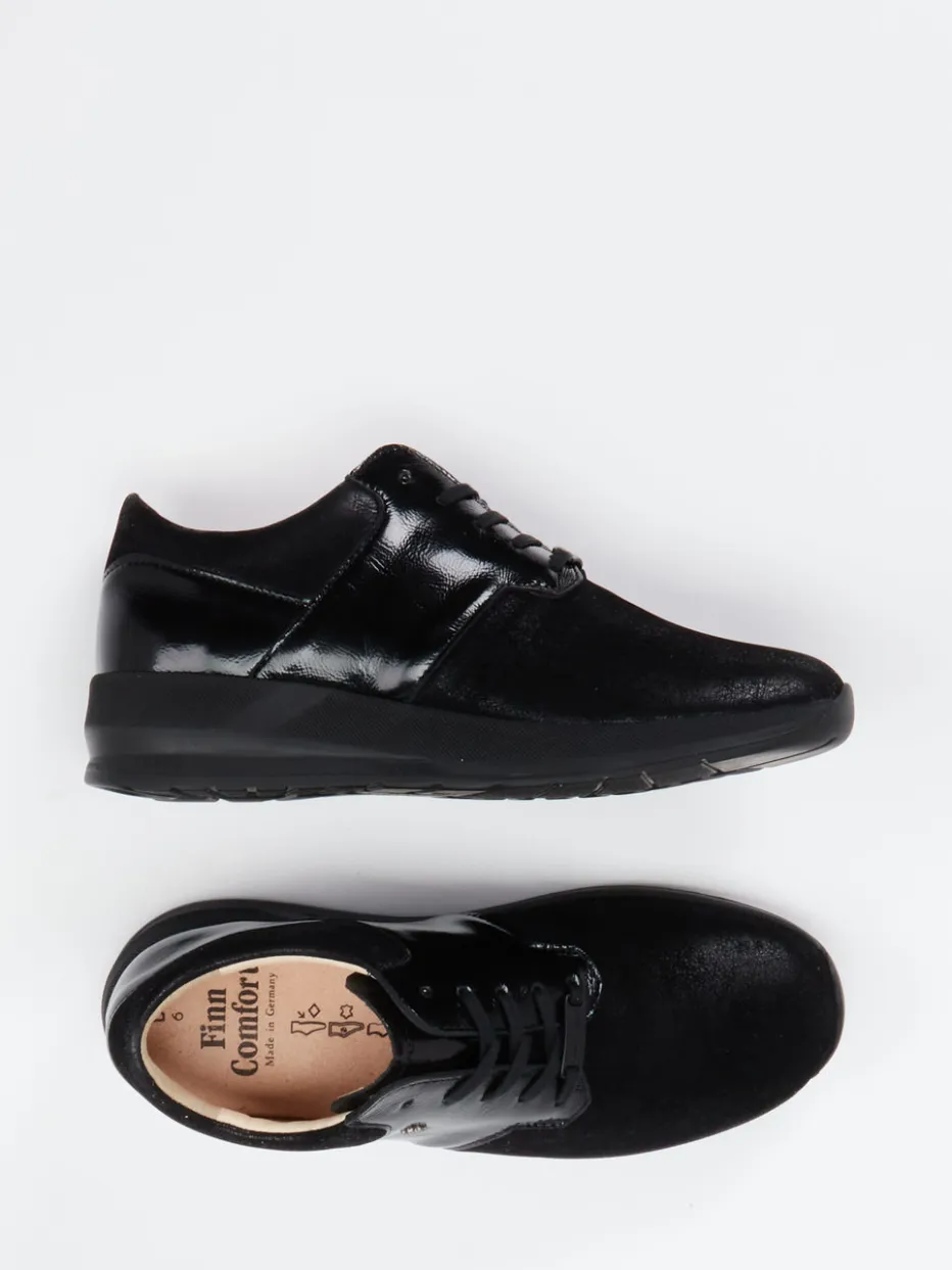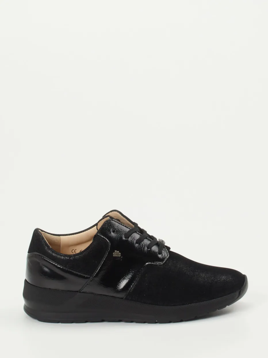 Moderner Komfort für Alltag und Büro.Finn Comfort präsentiert einen stilvollen Komfort-Sneaker für Damen. Ob im hektischen Berufsalltag oder beim Stadtbummel – dieses Modell vereint weich gepolsterten Laufkomfort mit dezenter Eleganz. Das Obermaterial aus schwarzem Stretch wird durch glänzende Lackleder-Elemente kontrastreich akzentuiert, während Veloursleder-Partien dem Design eine matte Tiefe verleihen. Eine ergonomisch geformte Profilsohle sorgt für zuverlässige Trittsicherheit, das austauschbare Kork-Fußbett unterstützt individuellen Komfort. Die dezente Ton-in-Ton-Optik und das zurückhaltende Markenlogo unterstreichen den klaren Streetwear-inspirierten Look. Ein souverän stilvoller Schuh mit funktionaler Substanz – typisch Finn Comfort.