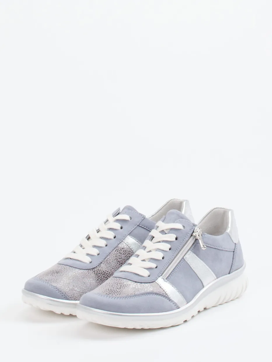 Bequemer Stil in sanftem Pastell.Semler präsentiert diesen Komfort-Sneaker für Damen in modischem Pastellblau. Ideal für entspannte Alltagslooks überzeugt das Modell mit einem Mix aus dehnfähigem Stretch und samtig angeschliffenem Veloursleder. Die matt strukturierte Oberfläche wird durch silberne Metallic-Einsätze und einen schimmernden Animal-Print im Vorderfußbereich akzentuiert. Die klassische Rundform mit zusätzlichem Reißverschluss neben der Schnürung vereinfacht das Anziehen. Innen sorgt ein Leder-/Textilfutter mit Weite H für angenehmen Tragekomfort, auch für Einlagen geeignet. Die PU-Sohle mit leichtem Profil unterstreicht den sportlich-leichten Charakter des Designs. Ein funktionaler Freizeitschuh mit modischem Understatement – typisch Semler.