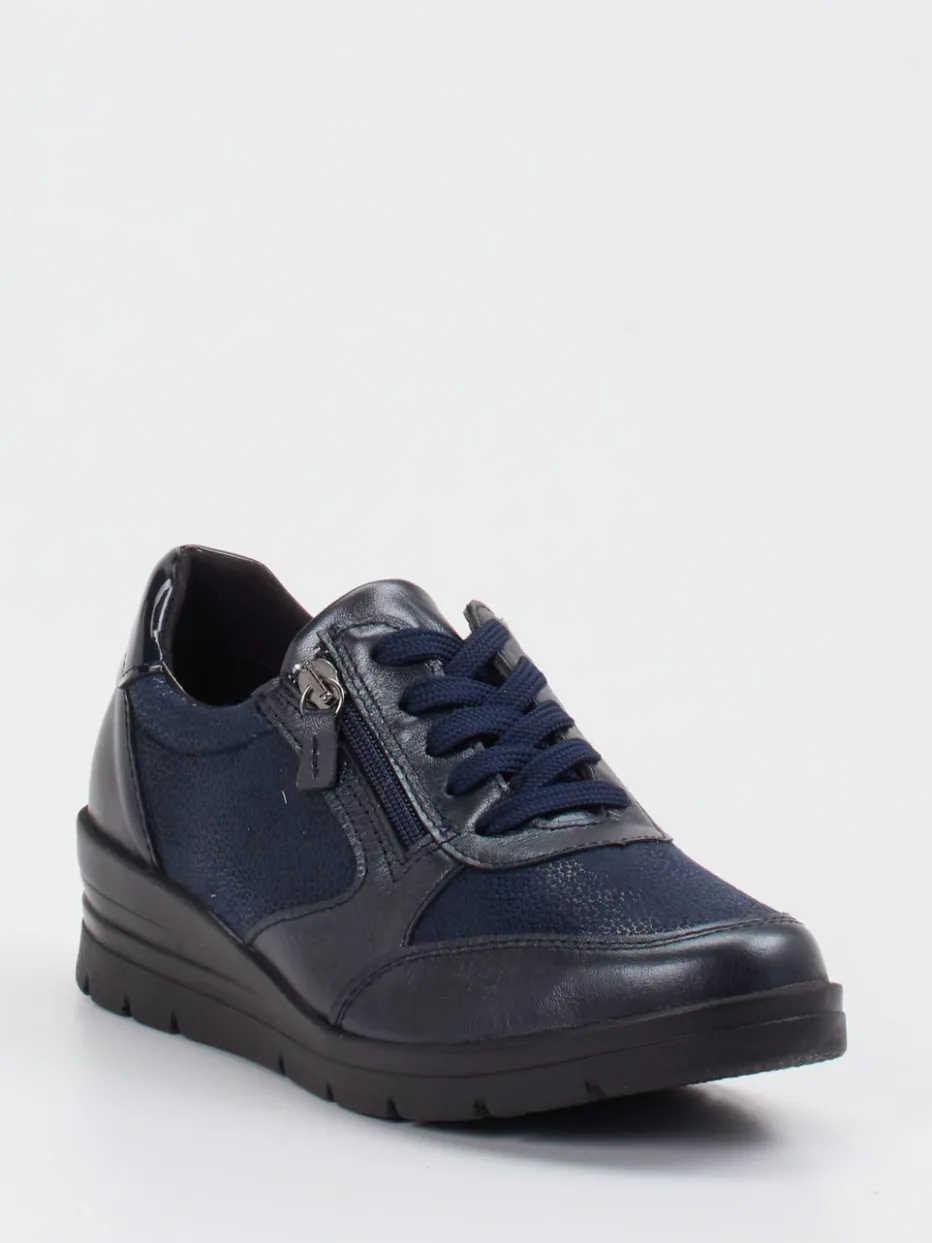 Eleganz trifft Alltagstauglichkeit.Cypres Soft präsentiert mit diesem Damen-Komfort-Sneaker ein sportlich-elegantes Modell mit Wohlfühlfaktor. Ideal für entspannte Alltagsmomente: Die Kombination aus elastischem Stretchmaterial und genarbtem Glattleder in Dunkelblau wird durch glänzende Overlays stilvoll akzentuiert. Die klassisch runde Form passt sich dank Weite K angenehm an, während Schnürung und seitlicher Reißverschluss ein bequemes Anziehen ermöglichen. Eine leichte PU-Keilsohle wirkt dämpfend und unterstreicht den funktionalen Charakter. Inspiriert vom „Comfort Revival“-Trend zeigt sich der Look lässig-modern. Harmoniert besonders gut mit Jeans und Steppjacke in dunklen Tönen. Hervorragender Komfort mit dezentem Metallic-Finish – typisch Cypres Soft.