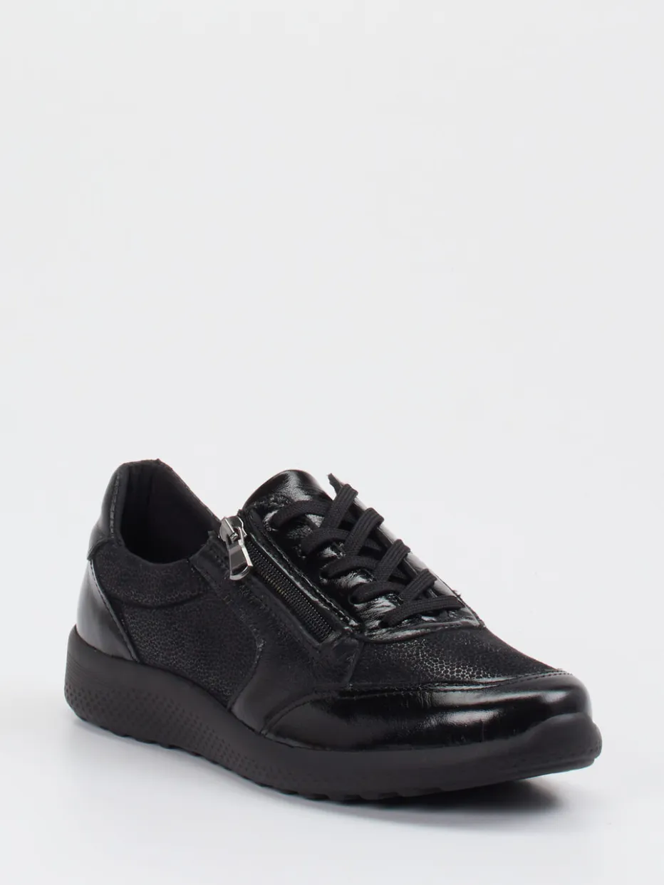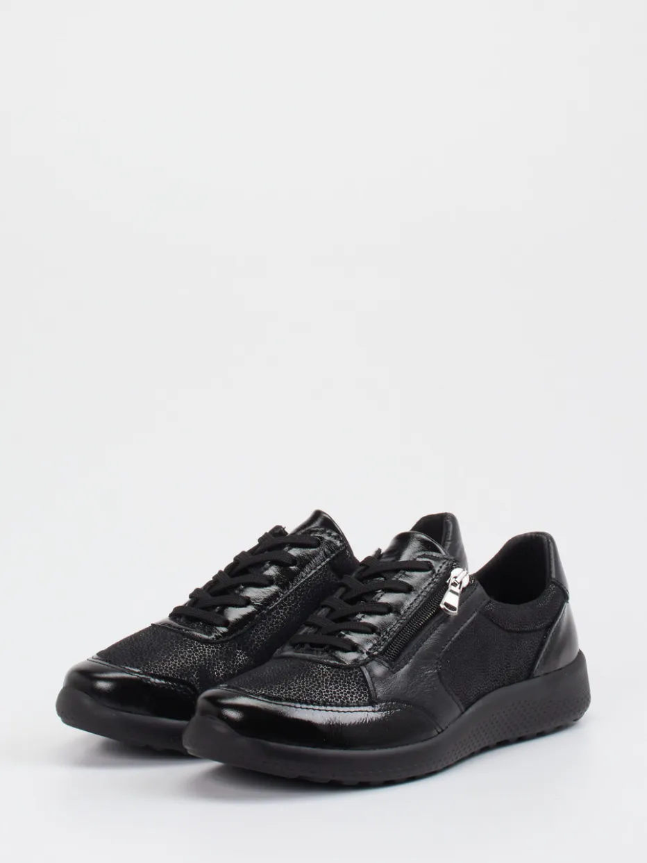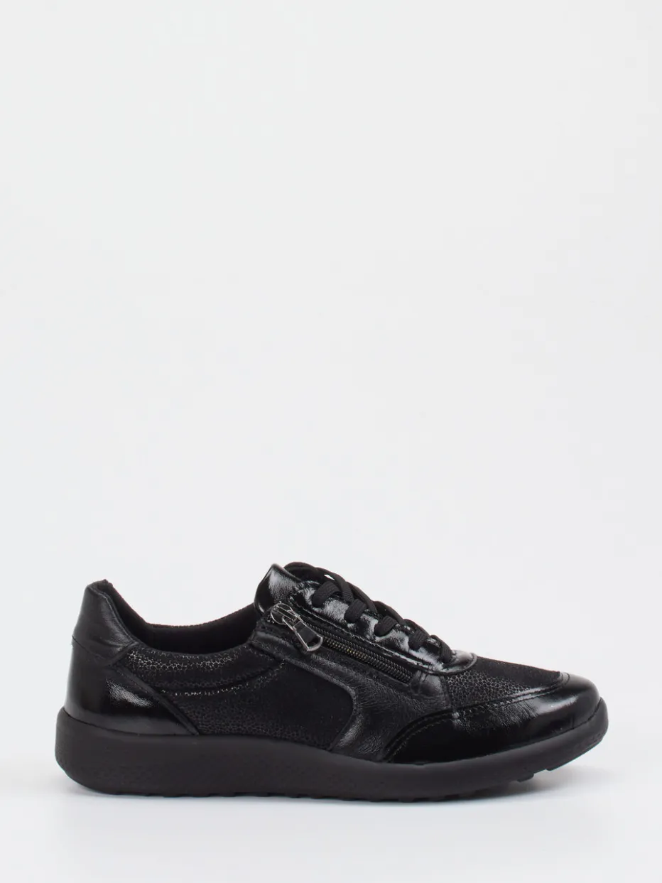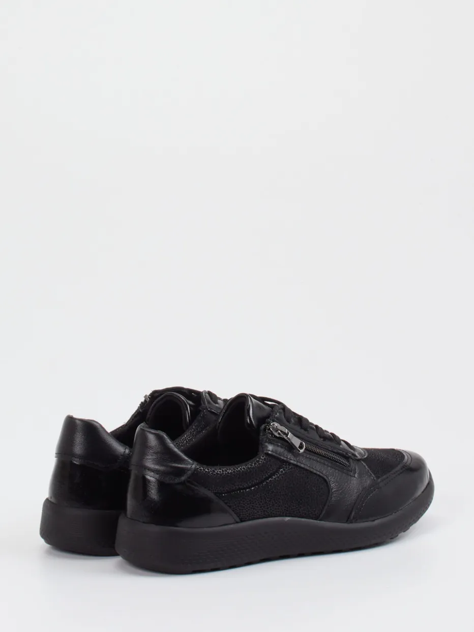 Schwarzer Komfort für entspannte Schritte.Cypres Soft überzeugt mit diesem bequemen Damen-Sneaker in zeitloser Silhouette. Ob bei Spaziergängen durch die Stadt oder beim entspannten Wochenend-Outfit – das flexible Stretchleder mit genarbter, leicht glänzender Oberfläche sitzt angenehm und formstark am Fuß. Kombiniert wird es mit einem gepolsterten Schaftrand, Microfaserfutter und einer rutschfesten PU-Sohle für zusätzlichen Komfort. Der seitliche Reißverschluss ergänzt die Schnürung und ermöglicht ein bequemes An- und Ausziehen. Die reine schwarze Farbgebung passt besonders gut zu minimalistischen Looks oder entspannten Streetwear-Kombinationen. Maximaler Komfort in durchdachtem Design – typisch Cypres Soft.