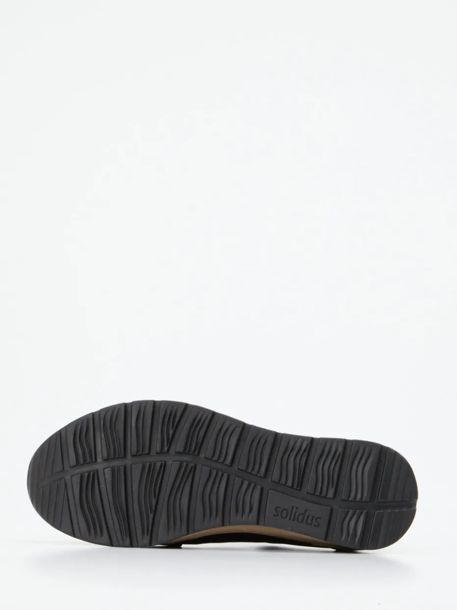 Stilvoller Komfort mit grafischem Akzent.Der Damen-Komfortsneaker von Solidus verbindet modische Raffinesse mit funktionellem Tragekomfort. Ideal für aktive Alltagssituationen, in denen Gehkomfort und Stil gefragt sind: Das Modell kombiniert braunes Veloursleder mit glatt glänzendem Kalbleder und einem markanten Leo-Druck auf Drucklederbasis. Eine sportlich-voluminöse Silhouette, tonal abgestufte Brauntöne und ein goldfarbener Reißverschluss prägen das Design. Dank H-Weite, gepolsterter Ferse und luftgepolstertem Korkfußbett entsteht ein angenehmes Laufgefühl – passgenau auch für eigene Einlagen. Der urbane Animal-Print liegt voll im Herbsttrend und harmoniert besonders gut mit warmtonigen Basics. Solidus steht hier für durchdachten Komfort in trendbewusster Ausführung.