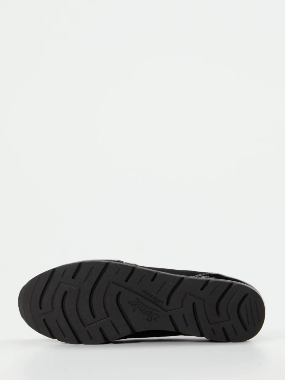 Materialkombination mit sicherem Auftritt.Dieser Damen-Komfort-Sneaker von Semler verbindet elegante Zurückhaltung mit funktionaler Raffinesse. Gefertigt aus Veloursleder, samtig angeschliffen, und glänzenden Lackleder-Partien, überzeugt das schwarze Modell durch seinen stilvollen Materialkontrast. Die klassische Sneakerform wird durch einen seitlichen Reißverschluss ergänzt, der das An- und Ausziehen erleichtert. Eine PU-Luftpolstersohle mit Profil sorgt für Trittsicherheit im Alltag. Dank Weite H und herausnehmbarem Fußbett bietet der Schuh hohen Tragekomfort – auch bei Einlagen. Ein leiser Luxus, der mit dem Trend „Quiet Luxury“ harmoniert. Ideal zu schmalen Stoffhosen oder monochromen Business-Looks. Semler steht dabei für bequeme Passform mit zeitgemäßer Eleganz.