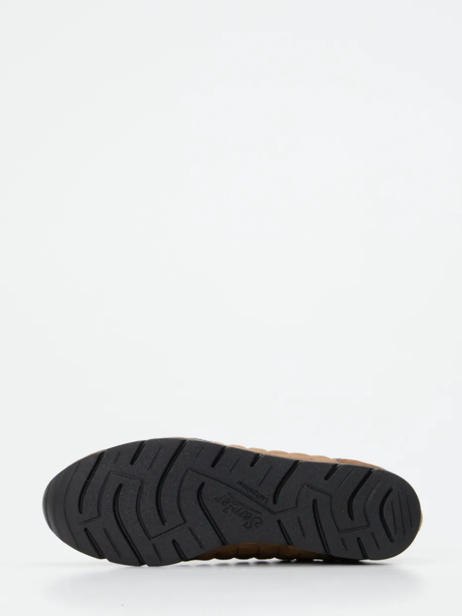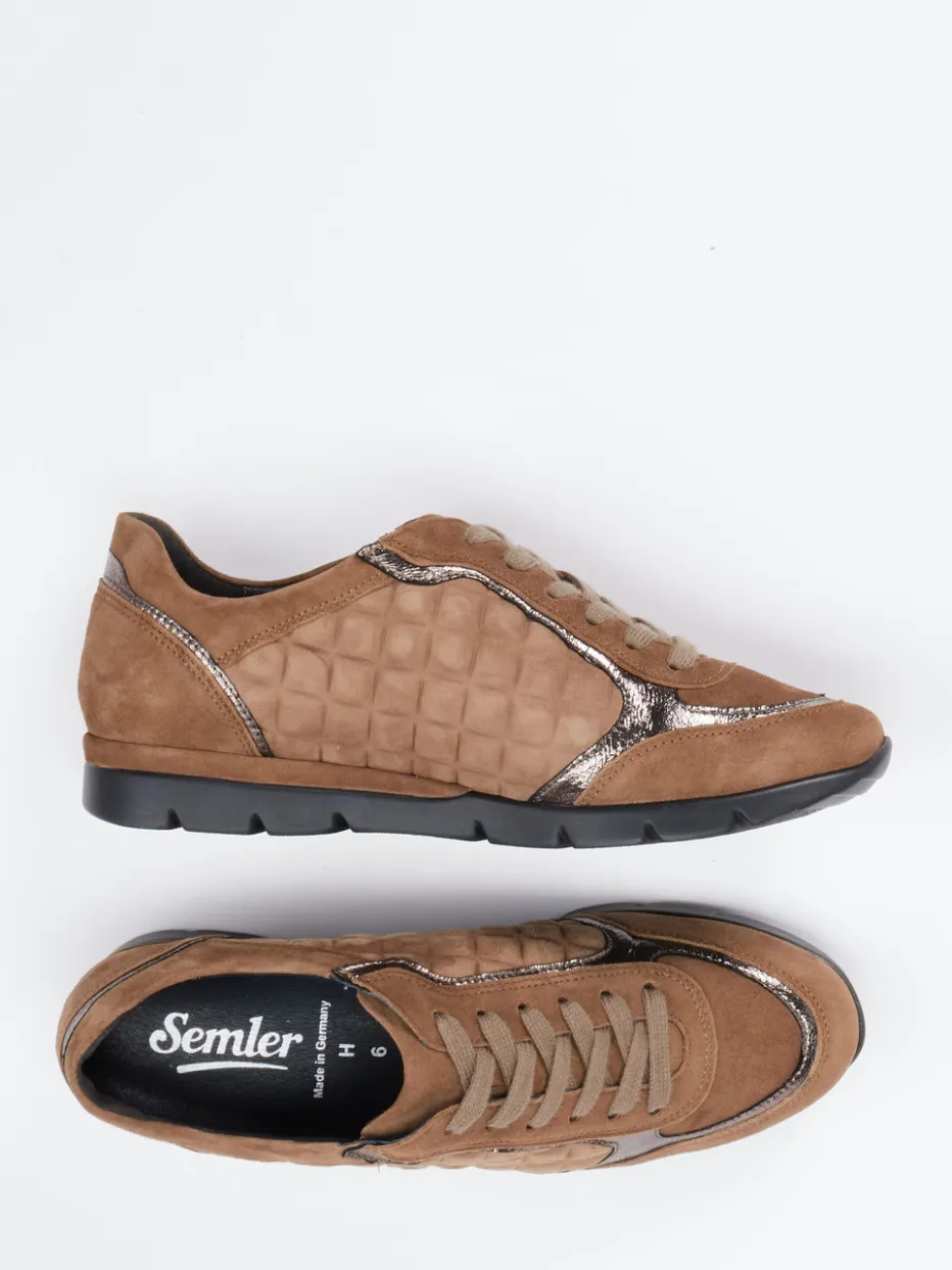Viel Komfort, dezentes Funkeln.Der Komfort-Sneaker von Semler verbindet Funktion und Design auf elegante Weise. Ideal für entspannte Alltagsmomente und längere Spaziergänge überzeugt das Modell durch hochwertiges Veloursleder in warmem Cognacbraun. Steppdetails in tonigem Nappaleder und fein eingearbeitete Metallic-Akzente in Bronzeoptik setzen stilvolle Kontraste. Die klassische Sneakerform mit Schnürung ergänzt sich mit einer gut profilierten PU-Sohle und einem weich gepolsterten Schaftrand für optimalen Halt. Die bequeme Weite H und das herausnehmbare Fußbett unterstreichen den funktionalen Anspruch, während sich das Design mühelos in Casuallooks einfügt. Semler steht für durchdachten Komfort mit dezentem Trendbewusstsein.