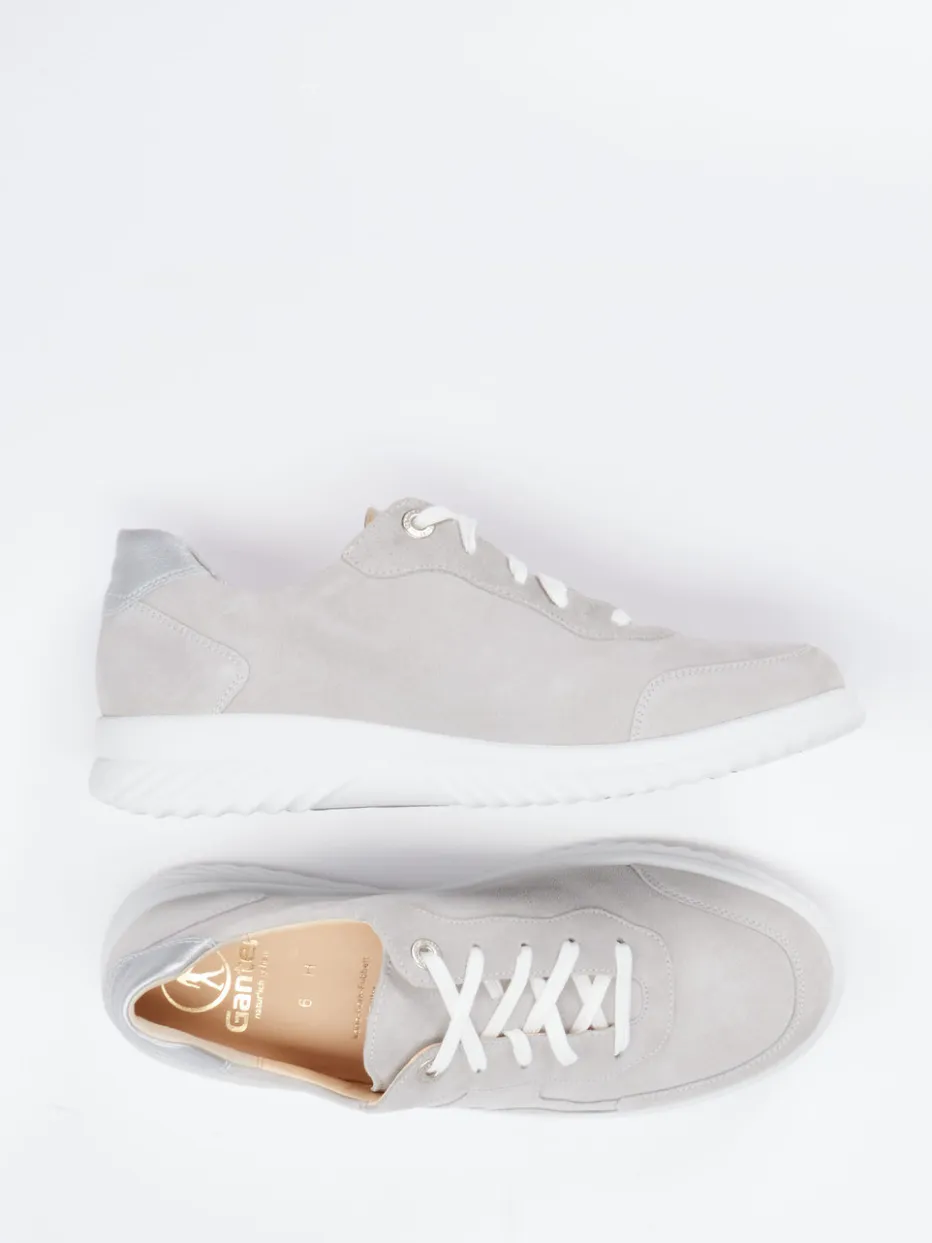 Leichtfüßig durch den Alltag.Ganter bietet mit diesem Komfort-Sneaker eine stilvolle Lösung für alle, die Wert auf Qualität und Bequemlichkeit legen. Ob beim Stadtbummel oder einem ausgedehnten Spaziergang – das hellgraue Veloursleder mit samtigem Finish sorgt für ein luftiges Tragegefühl. Feine Ton-in-Ton-Nähte betonen das sportlich abgerundete Design, während der silberfarbene Fersenbesatz dem Modell einen dezent modischen Akzent im Stil der Metallic-Trends AW24 verleiht. Die Schnürung ermöglicht eine exakte Weitenregulierung, das weich gepolsterte Innenfutter und die ergonomische 4-Punkte-Sohle tragen zu spürbarer Entlastung bei. Mit herausnehmbarer Innensohle und Weite H auch für orthopädische Einlagen gut geeignet. Höchster Komfort trifft auf zeitgemäßes Design im Zeichen funktionaler Eleganz.