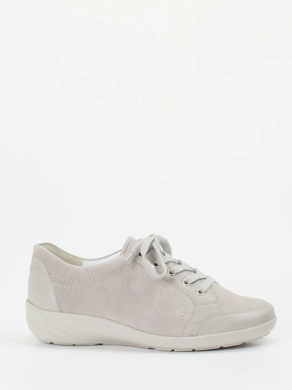 Der Komfort-Sneaker von Semler vereint dezente Ästhetik mit funktionalem Design. Gefertigt aus hochwertigem Veloursleder, das samtig angeschliffen ist, überzeugt das Modell in einem hellgrauen Ton mit matter Oberfläche. Die abgerundete Silhouette, Metallösen, Ton-in-Ton-Nähte und der gepolsterte Schaftrand unterstreichen seine komfortorientierte Gestaltung. Eine ergonomische PU-Sohle mit rutschhemmendem Profil unterstützt langes Gehen und Stehen. Der Sneaker passt ideal zu minimalistischen Casual-Looks und verkörpert mit seiner leisen Eleganz den „Quiet Luxury“-Trend der Saison.
