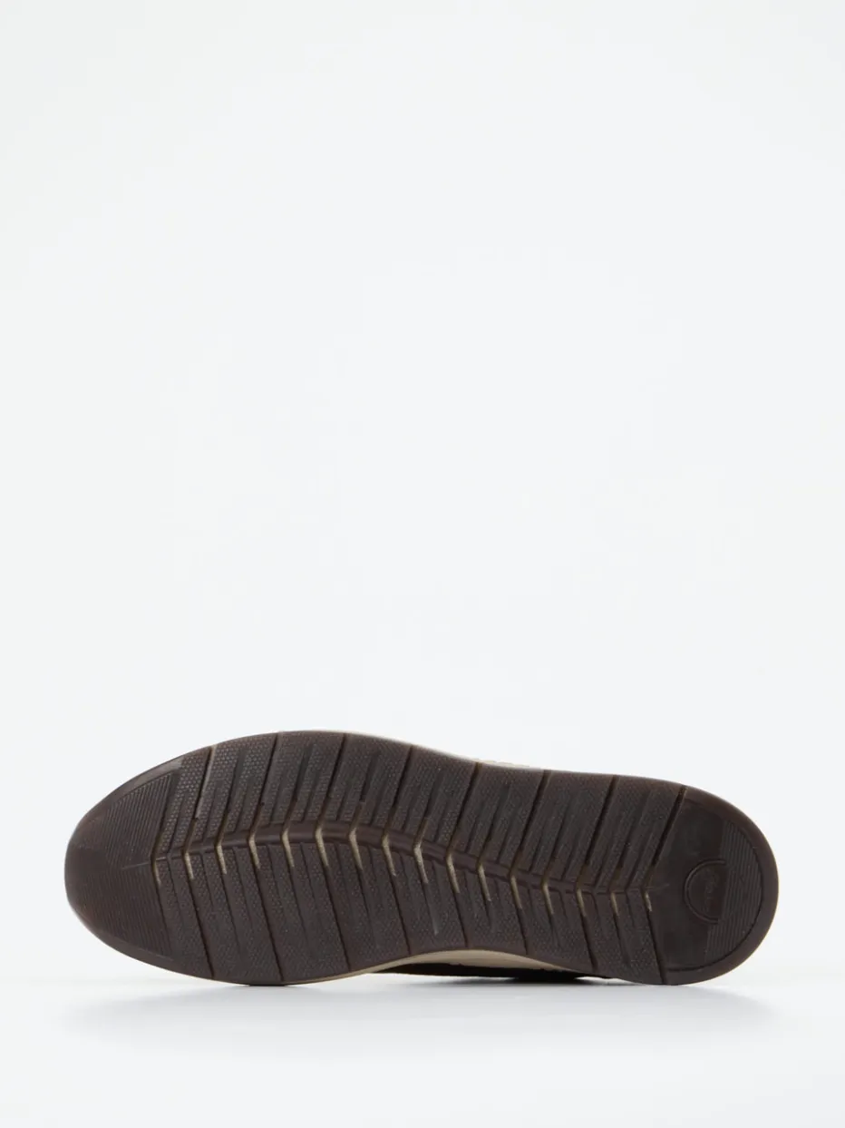 Der Schnürschuh besteht aus beigebraunem Veloursleder, kombiniert mit farblich harmonierendem Glattleder – teils glatt, teils perforiert. Ein seitlicher Reißverschluss erleichtert das Anziehen, während die Gummisohle mit dunkelbraunem Profil griffig und alltagstauglich bleibt. Der flache Schnitt unterstreicht das klassische Freizeitdesign. Passend zum Trend „Quiet Comfort“ fügt sich der Sneaker mühelos in natürliche Looks ein und lässt sich ideal mit Chinos und Cardigans in Erdtönen kombinieren.
