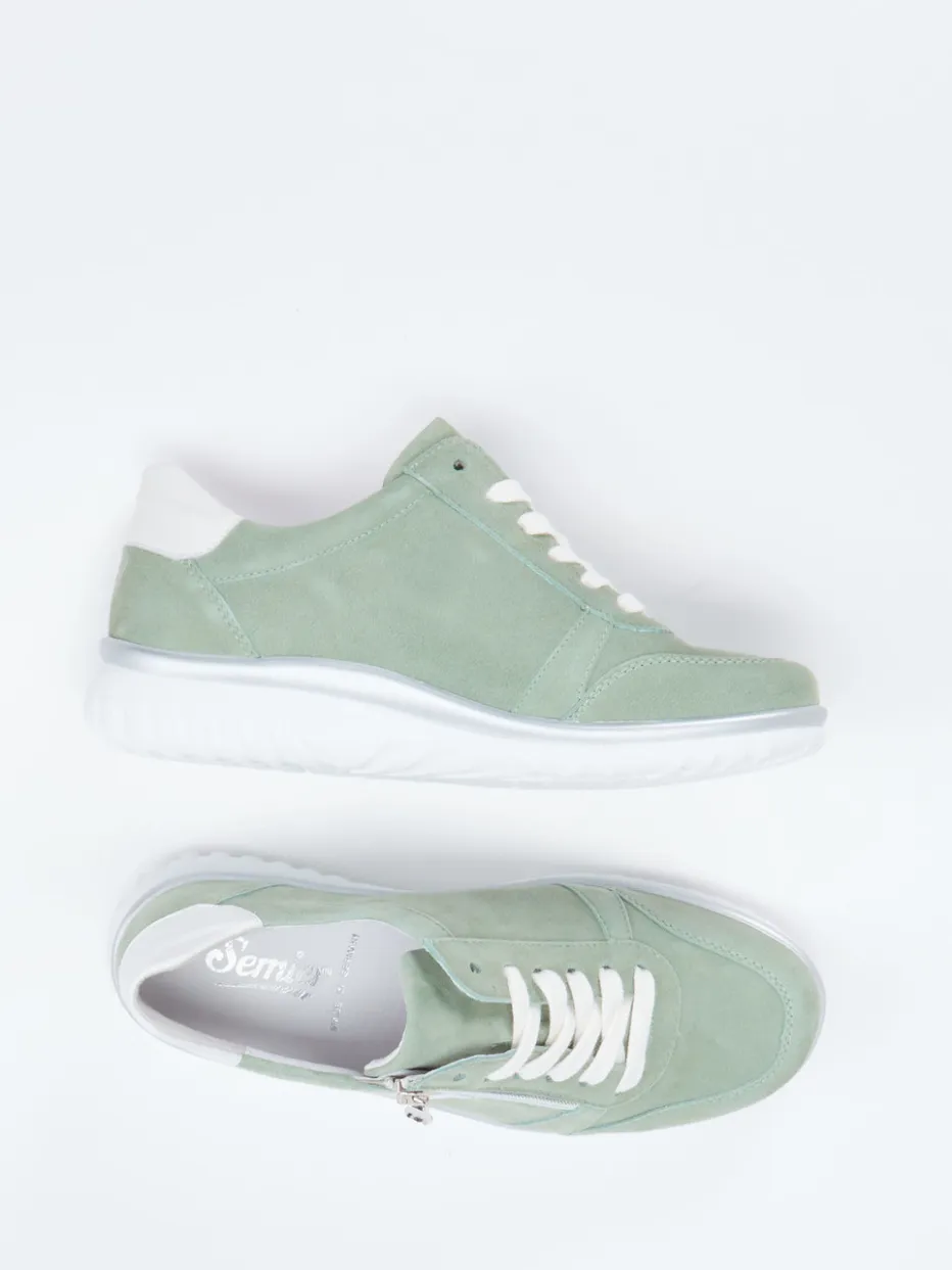 Semler präsentiert einen Damen-Komfort-Sneaker aus anschmiegsamem Veloursleder in trendigem Salbeigrün. Ergänzt durch silberfarbene Akzente und weißen Kontrastbesatz wirkt das Modell frisch und stilbewusst zugleich.