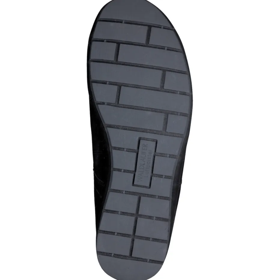Für entspanntes Gehen im Alltag.Die Marke Waldläufer präsentiert eine komfortable Damen-Stiefelette in klassischem Schwarz. Ideal für lange Tage und kalte Jahreszeiten verbindet dieses Modell weiches Nubukleder mit Einsätzen aus glattem Kalbleder. Der glänzende Lackabschluss an der Ferse sowie eine femininen Zierapplikation mit Strasssteinen setzen dezente Designakzente. Die knöchelhohe Form mit breitem Klettverschluss lässt sich individuell anpassen. Innen sorgt eine warme Textilfütterung für Wohlgefühl, das gepolsterte und herausnehmbare Fußbett unterstützt den Einsatz eigener Einlagen. Die rutschhemmende Luftpolstersohle bietet sicheren Halt auf glatten Untergründen – ein Treffer für alle Quiet-Luxury-Enthusiastinnen. Verlässlicher Komfort trifft eleganten Minimalismus – typisch Waldläufer.